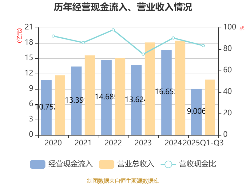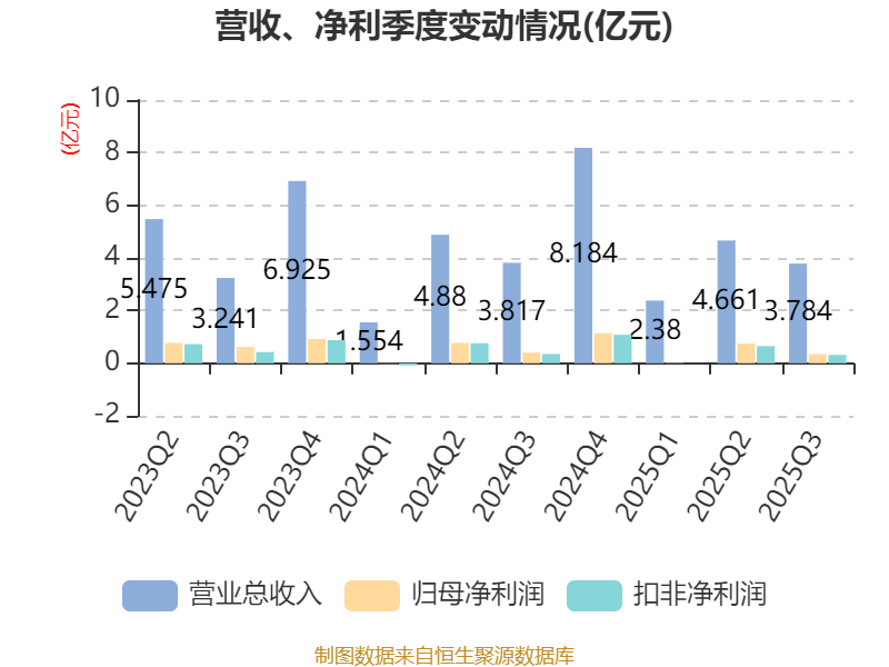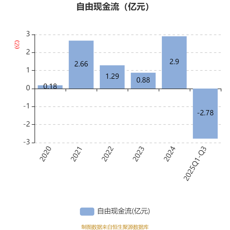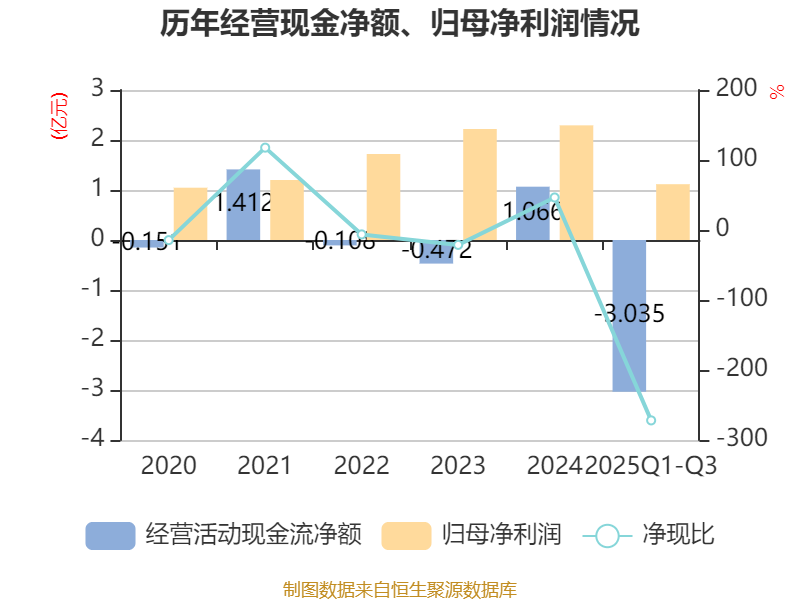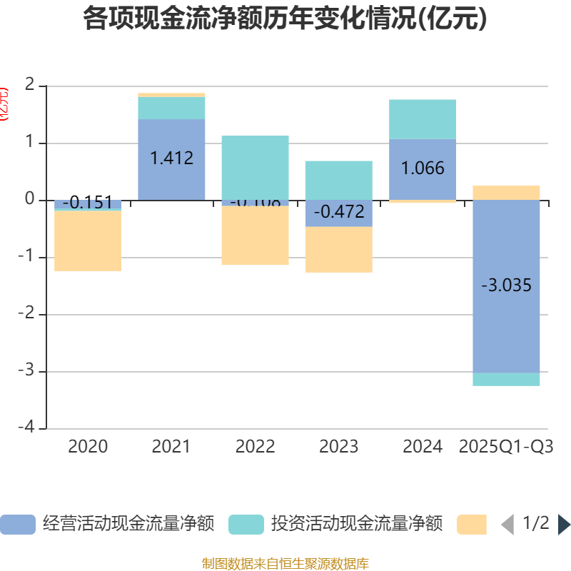 2025年前三季度,公司经营活动现金流净额为-3.03亿元,同比增加3982.54万元;筹资活动现金流净额2490.58万元,同比减少1.31亿元;投资活动现金流净额-2252.79万元,上年同期为6410.2万元。