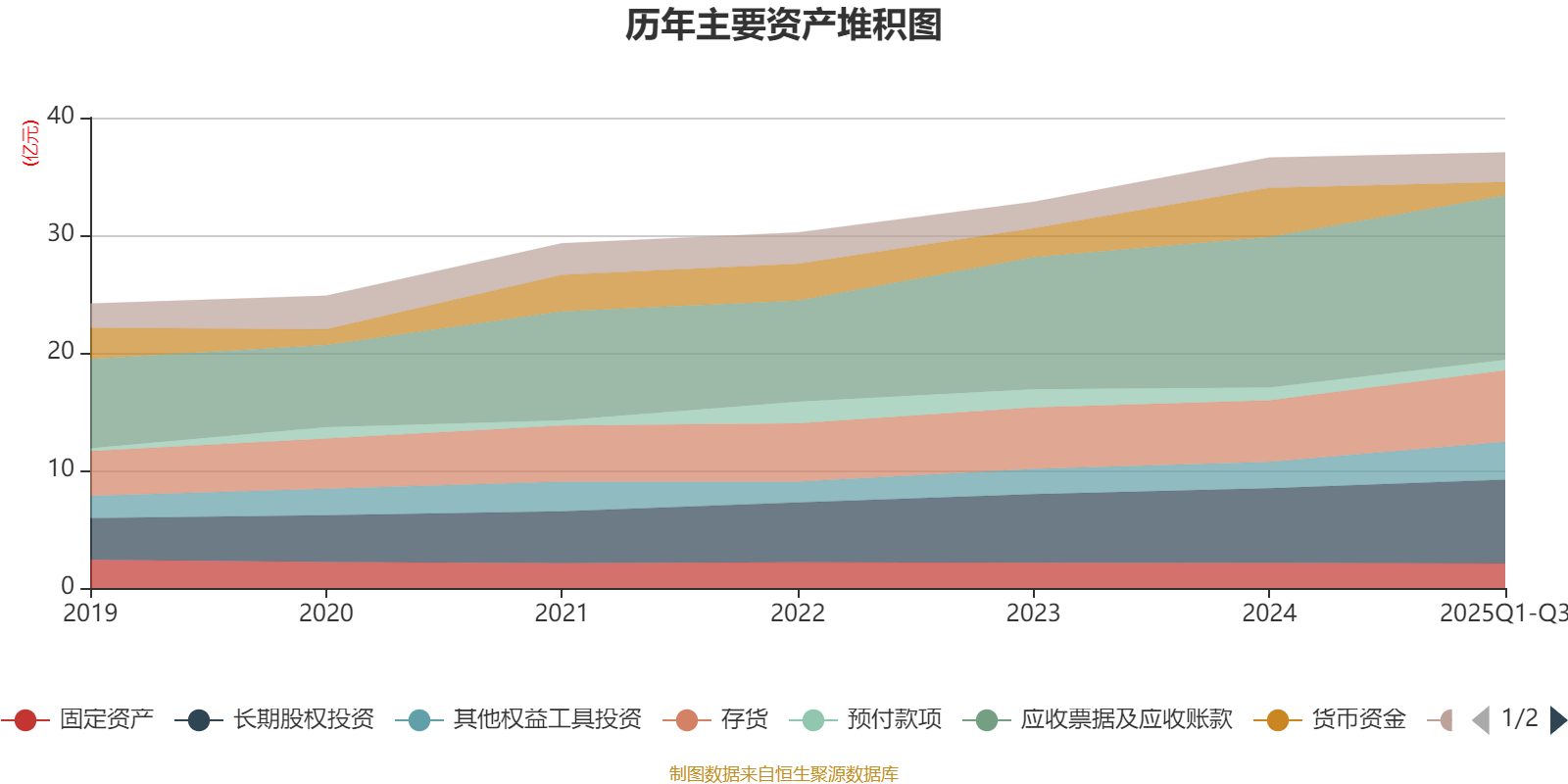 资产重大变化方面,截至2025年三季度末,公司货币资金较上年末减少72.98%,占公司总资产比重下降8.35个百分点;应收票据及应收账款较上年末增加9.29%,占公司总资产比重上升2.81个百分点;其他权益工具投资较上年末增加42.94%,占公司总资产比重上升2.54个百分点;存货较上年末增加16.06%,占公司总资产比重上升2.1个百分点。