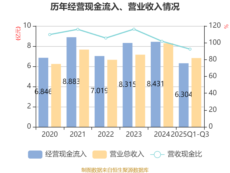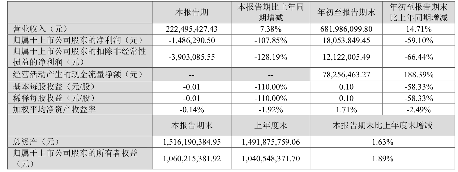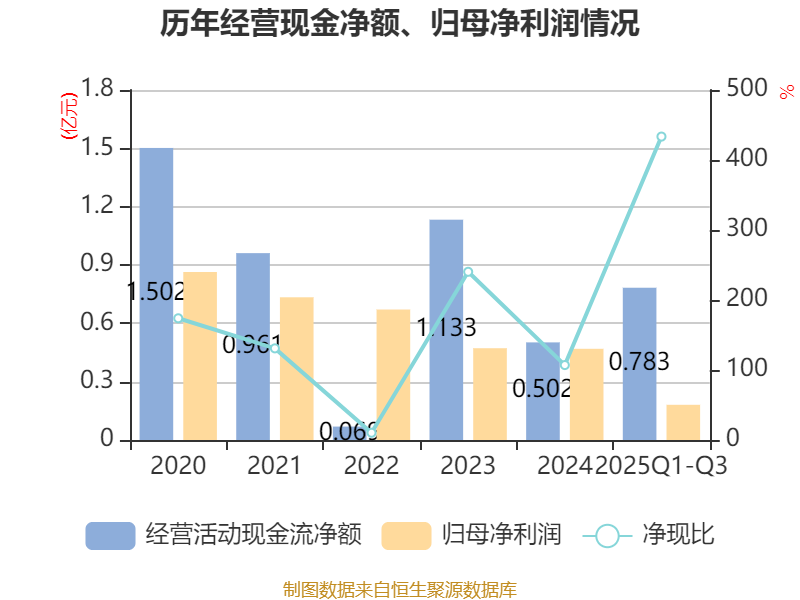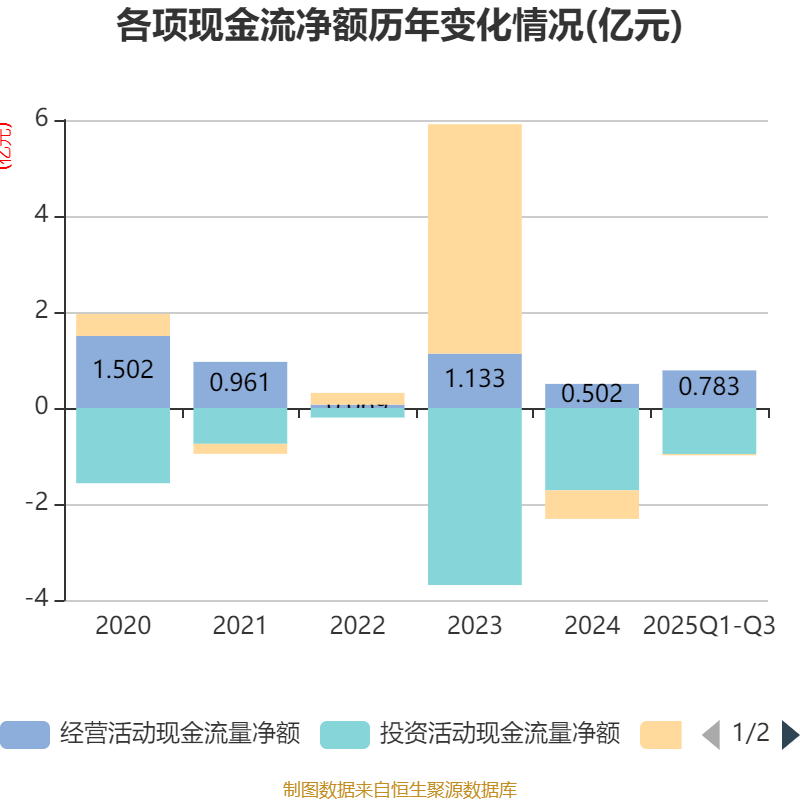 2025年前三季度,公司经营活动现金流净额为7825.65万元,同比增长188.39%;筹资活动现金流净额-280.26万元,同比增加3452.07万元;投资活动现金流净额-9581.89万元,上年同期为-1亿元。