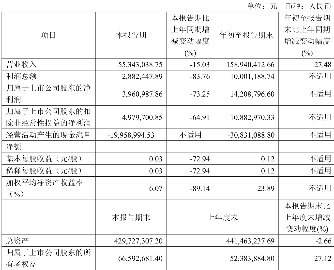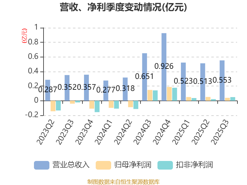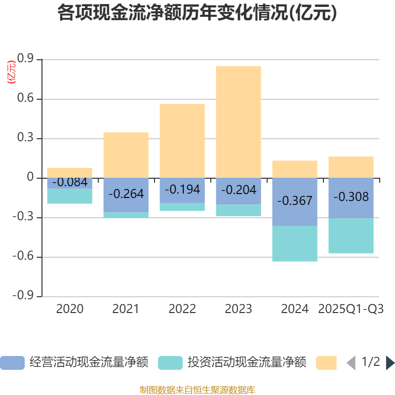 2025年前三季度,公司经营活动现金流净额为-3083.11万元,同比增加812.6万元;筹资活动现金流净额1610.23万元,同比增加4203.45万元;投资活动现金流净额-2663.67万元,上年同期为-1857.11万元。
