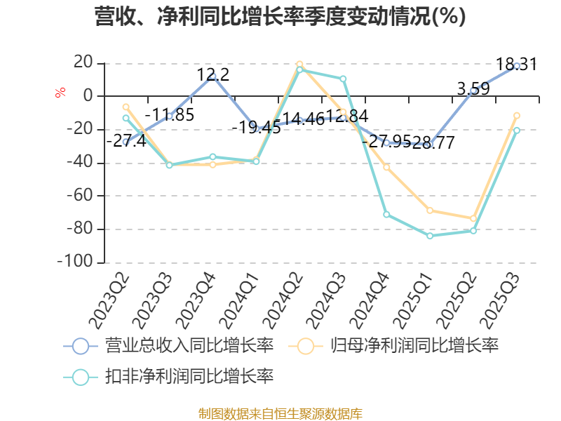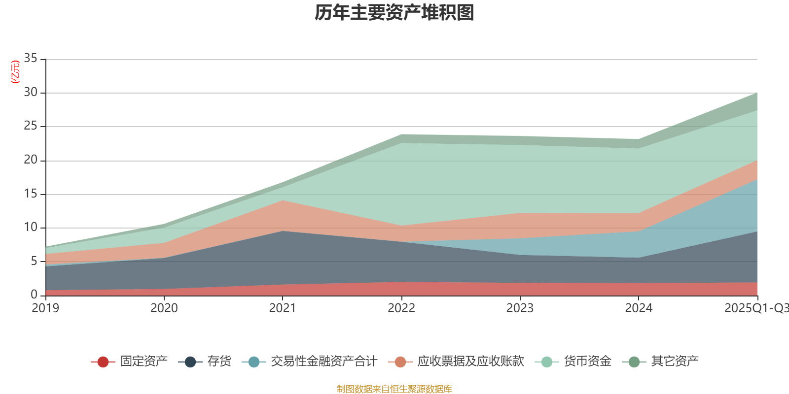 资产重大变化方面,截至2025年三季度末,公司货币资金较上年末减少22.62%,占公司总资产比重下降16.63个百分点;存货较上年末增加100.95%,占公司总资产比重上升8.9个百分点;交易性金融资产合计较上年末增加97.4%,占公司总资产比重上升8.81个百分点;应收票据及应收账款较上年末增加4.1%,占公司总资产比重下降2.32个百分点。