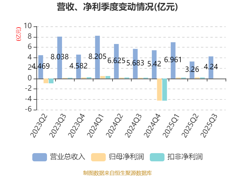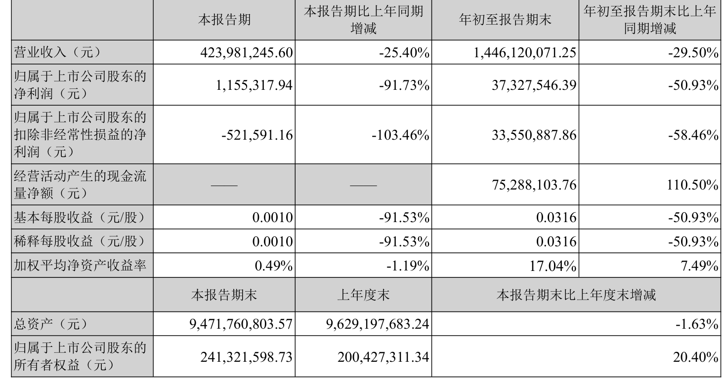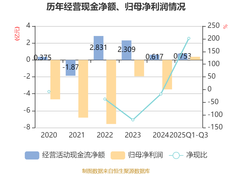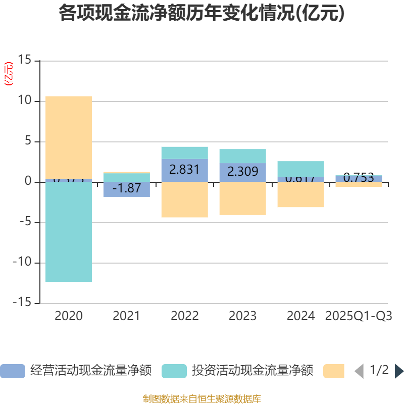 2025年前三季度,公司经营活动现金流净额为7528.81万元,同比增加7.93亿元;筹资活动现金流净额-6291.4万元,同比增加1.4亿元;投资活动现金流净额696.42万元,上年同期为8.63亿元。