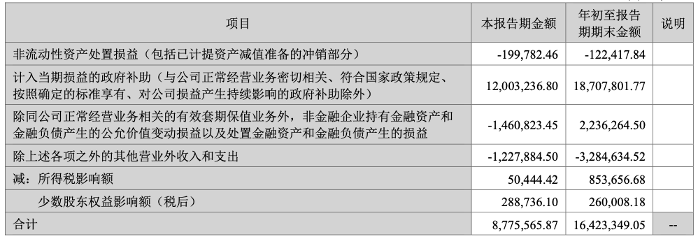 三季报显示,前三季度公司计入当期损益的政府补助为1870.8万元,第三季度为1200.3万元。