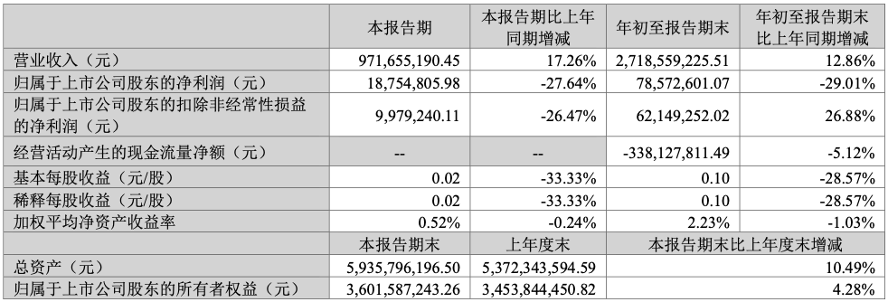 10月28日,润和软件(300339)发布2025年三季报,公司第三季度营业收入9.72亿元,同比增长17.26%;净利润1875.48万元,同比下降27.64%。2025年前三季度营业收入27.19亿元,同比增长12.86%;净利润7857.26万元,同比下降29.01%,扣非归母净利润6214.93万元,同比增长26.88%;基本每股收益0.1元。