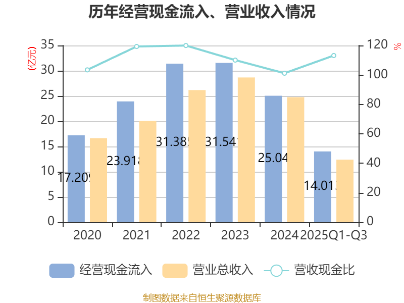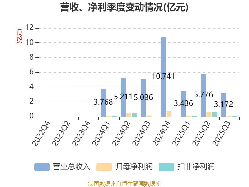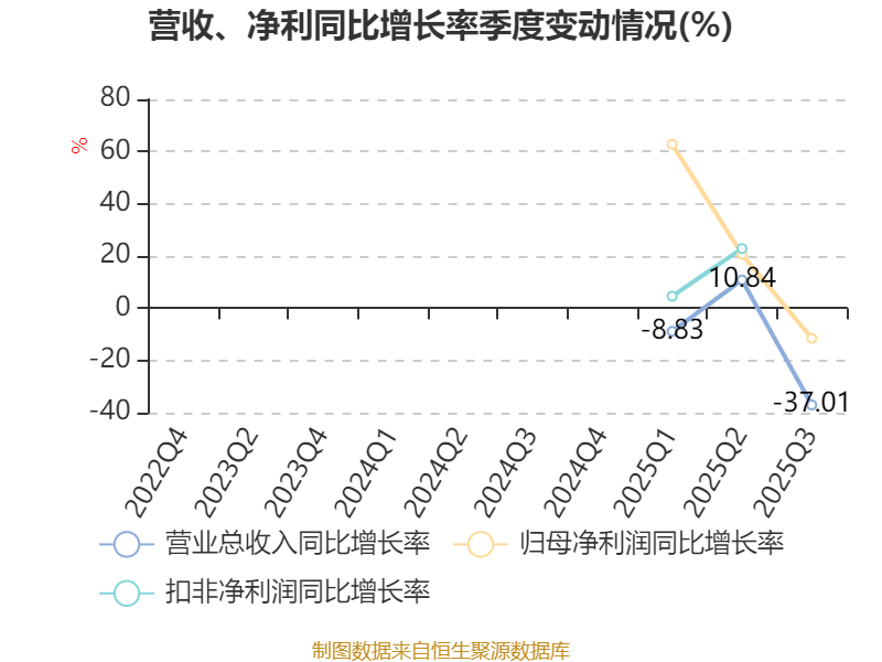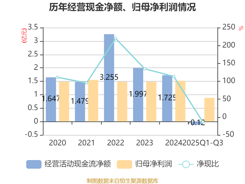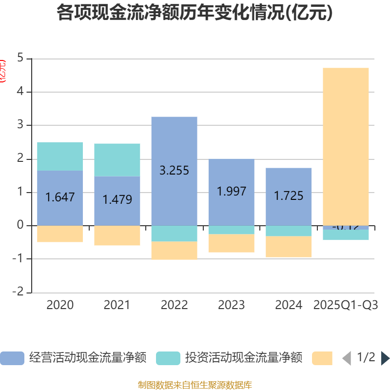 2025年前三季度,公司经营活动现金流净额为-1196.06万元,同比增加1.44亿元;筹资活动现金流净额4.72亿元,同比增加5.33亿元;投资活动现金流净额-3070.91万元,上年同期为-1864.71万元。