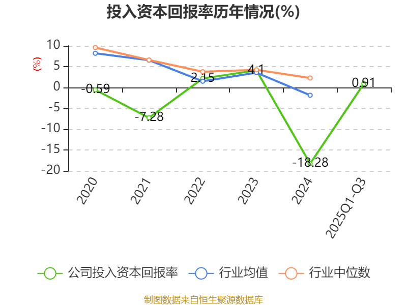 盈利能力方面, 2025年前三季度公司加权平均净资产收益率为-5.41%,同比下降4.51个百分点。公司2025年前三季度投入资本回报率为0.91%,较上年同期下降0.69个百分点。