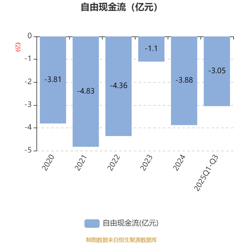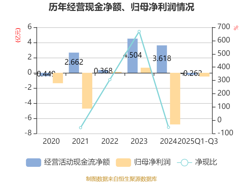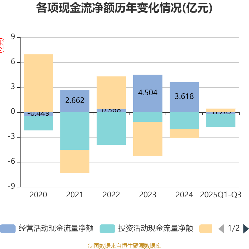 2025年前三季度,公司经营活动现金流净额为-2623.01万元,同比减少1.46亿元;筹资活动现金流净额4185.53万元,同比增加4803.88万元;投资活动现金流净额-1.5亿元,上年同期为-1.37亿元。