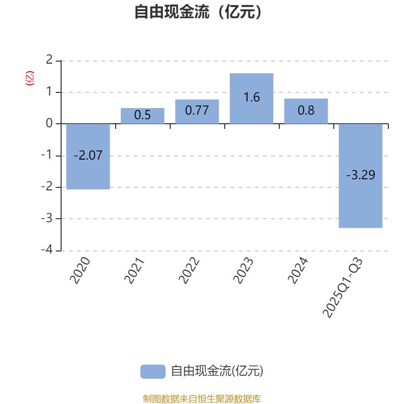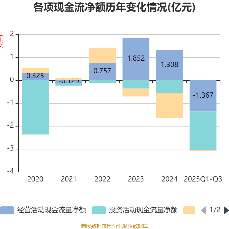 2025年前三季度,公司经营活动现金流净额为-1.37亿元,同比减少5003.36万元;筹资活动现金流净额-449.64万元,同比增加6368.44万元;投资活动现金流净额-1.68亿元,上年同期为-2.25亿元。