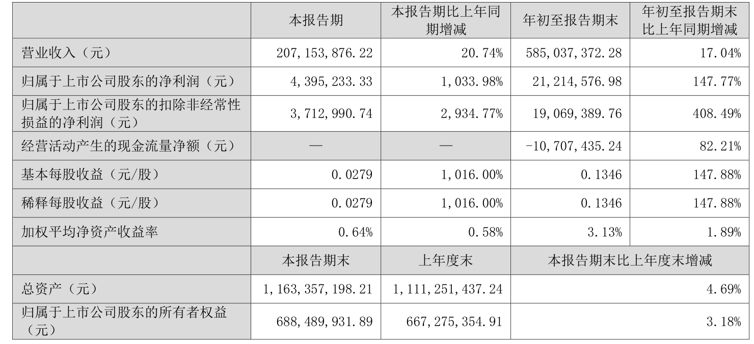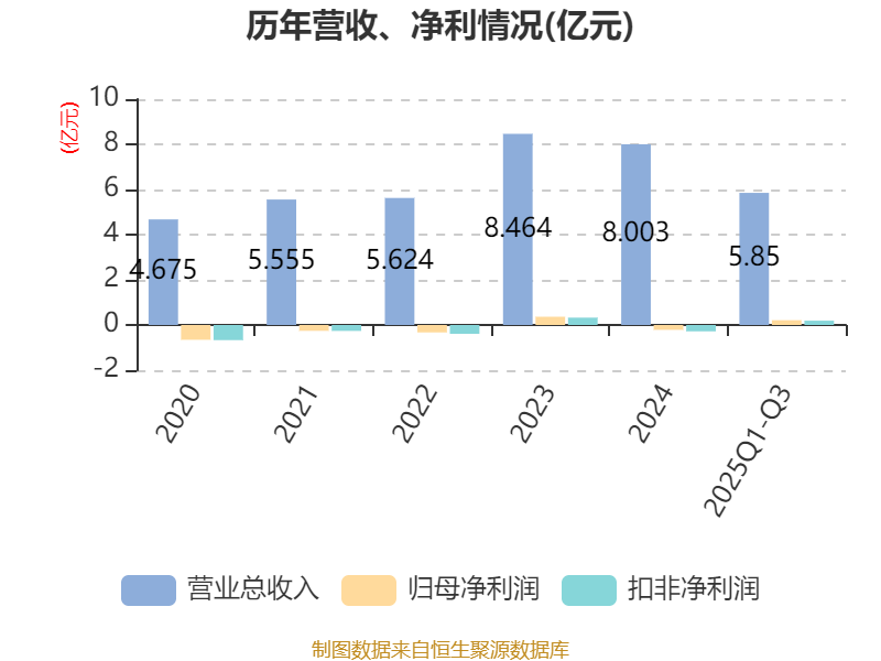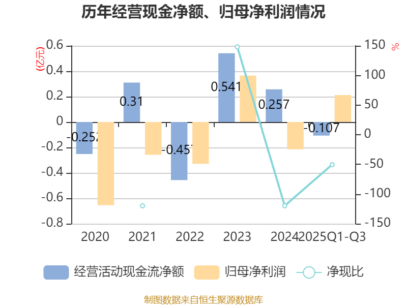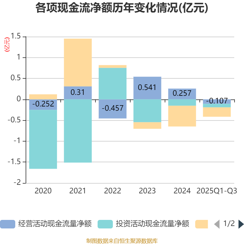 2025年前三季度,公司经营活动现金流净额为-1070.74万元,同比增加4947.04万元;筹资活动现金流净额-2253.32万元,同比减少2546.71万元;投资活动现金流净额-843.21万元,上年同期为-687.67万元。