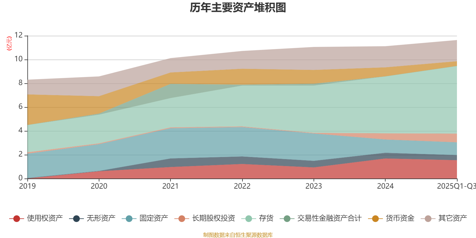 资产重大变化方面,截至2025年三季度末,公司存货较上年末增加18.63%,占公司总资产比重上升5.74个百分点;货币资金较上年末减少47.15%,占公司总资产比重下降3.35个百分点;使用权资产较上年末减少8.67%,占公司总资产比重下降1.93个百分点;长期股权投资较上年末增加43.02%,占公司总资产比重上升1.69个百分点。