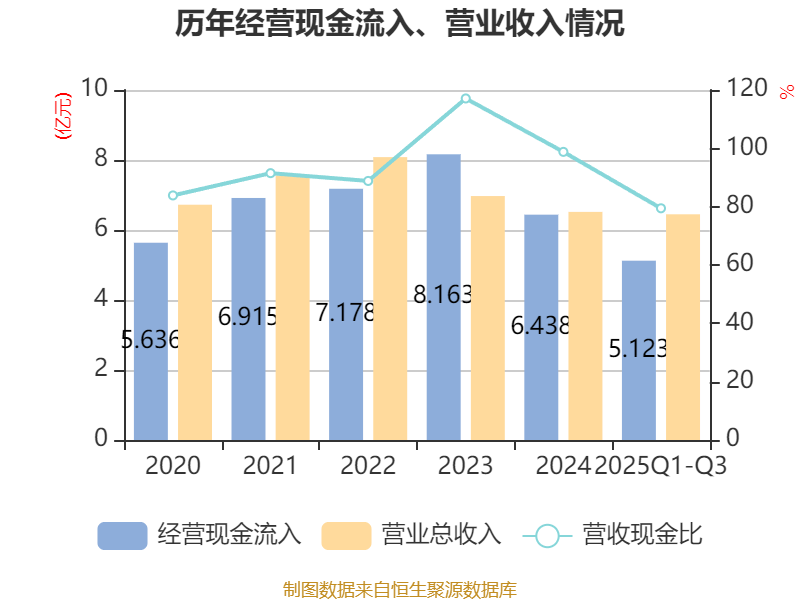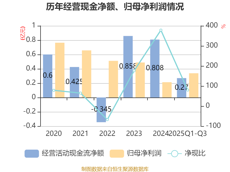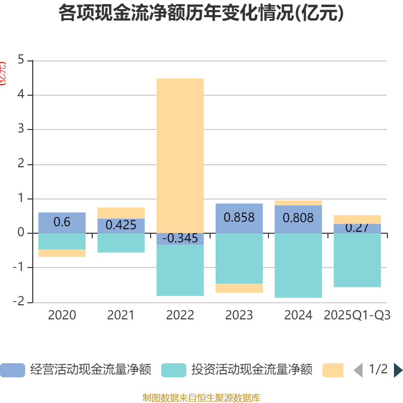 2025年前三季度,公司经营活动现金流净额为2703.66万元,同比下降52.12%;筹资活动现金流净额2500.22万元,同比增加2855.19万元;投资活动现金流净额-1.57亿元,上年同期为-9787.35万元。
