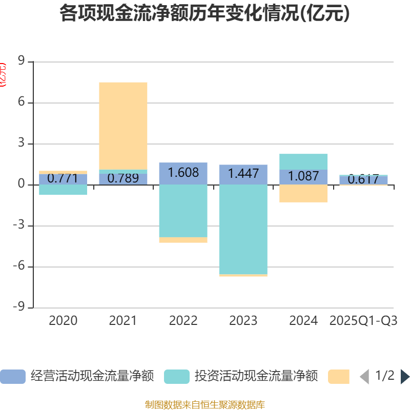 2025年前三季度,公司经营活动现金流净额为6166.42万元,同比下降0.04%;筹资活动现金流净额-743.72万元,同比增加1.21亿元;投资活动现金流净额856.93万元,上年同期为1.65亿元。
