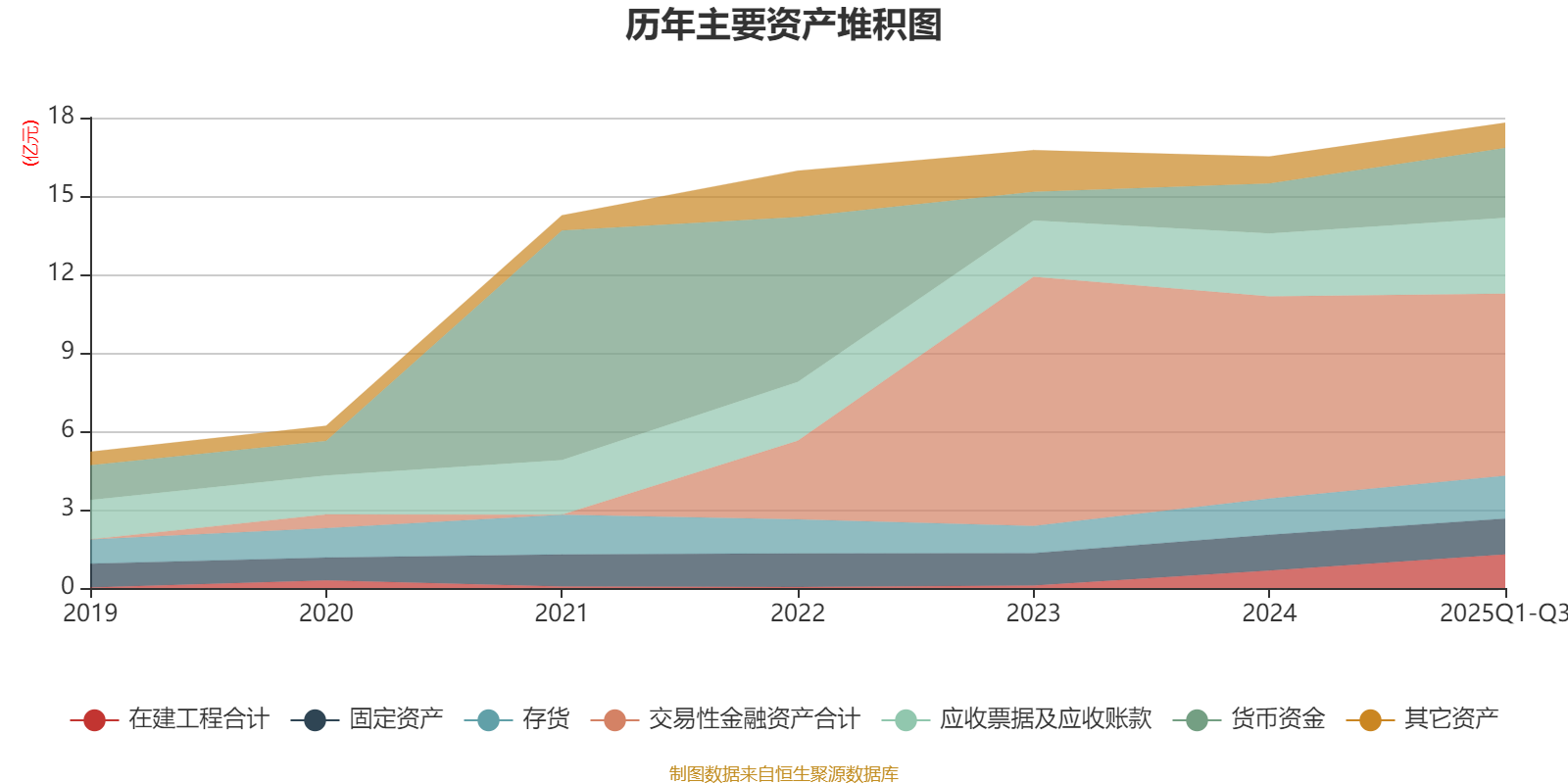 资产重大变化方面,截至2025年三季度末,公司交易性金融资产合计较上年末减少9.93%,占公司总资产比重下降7.7个百分点;货币资金较上年末增加40.05%,占公司总资产比重上升3.46个百分点;在建工程合计较上年末增加91.13%,占公司总资产比重上升3.13个百分点;应收票据及应收账款较上年末增加20.2%,占公司总资产比重上升1.68个百分点。