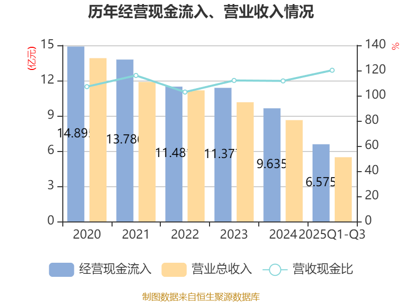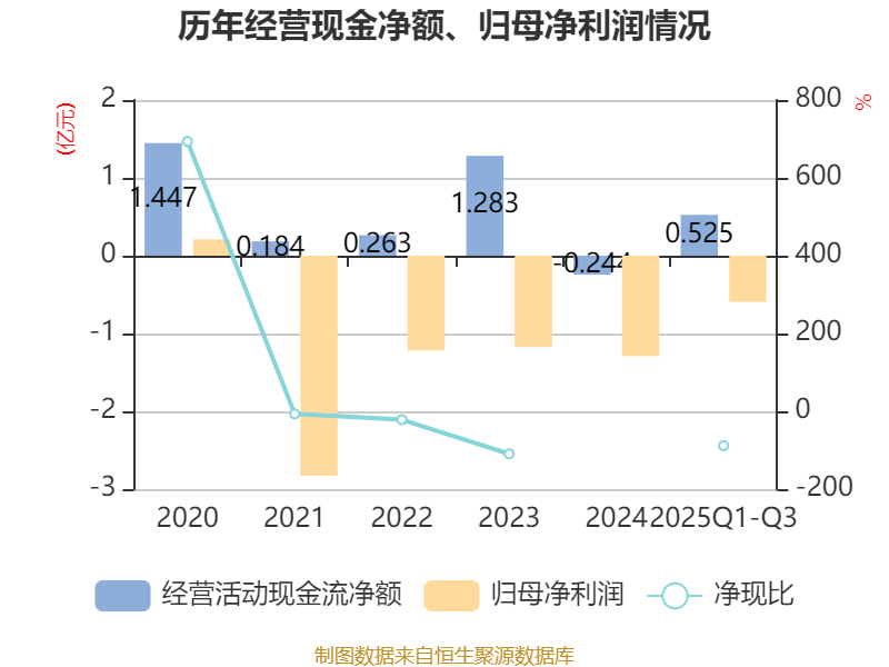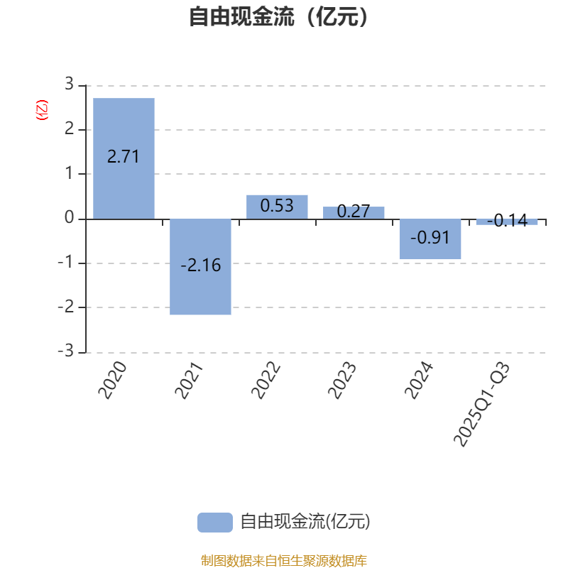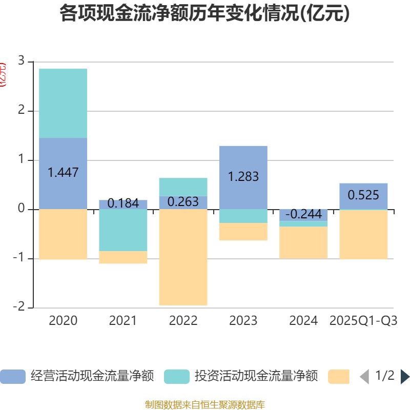 2025年前三季度,公司经营活动现金流净额为5253.37万元,同比增加9856.38万元;筹资活动现金流净额-9968.34万元,同比减少5933.68万元;投资活动现金流净额-228.5万元,上年同期为-1477.41万元。