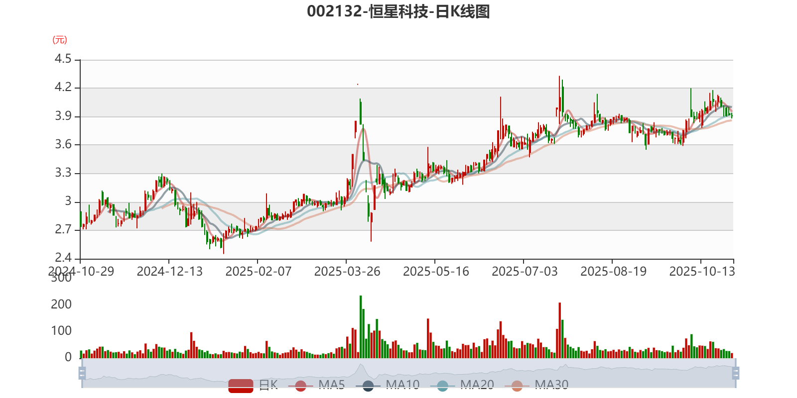 中证智能财讯恒星科技(002132)10月29日披露2025年第三季度报告。前三季度公司实现营业总收入38.23亿元,同比增长3.63%;归母净利润2014.17万元,同比增长8.22%;扣非净利润亏损504.07万元,上年同期盈利1384.38万元;经营活动产生的现金流量净额为3.68亿元,同比下降21.72%;报告期内,恒星科技基本每股收益为0.0152元,加权平均净资产收益率为0.57%。