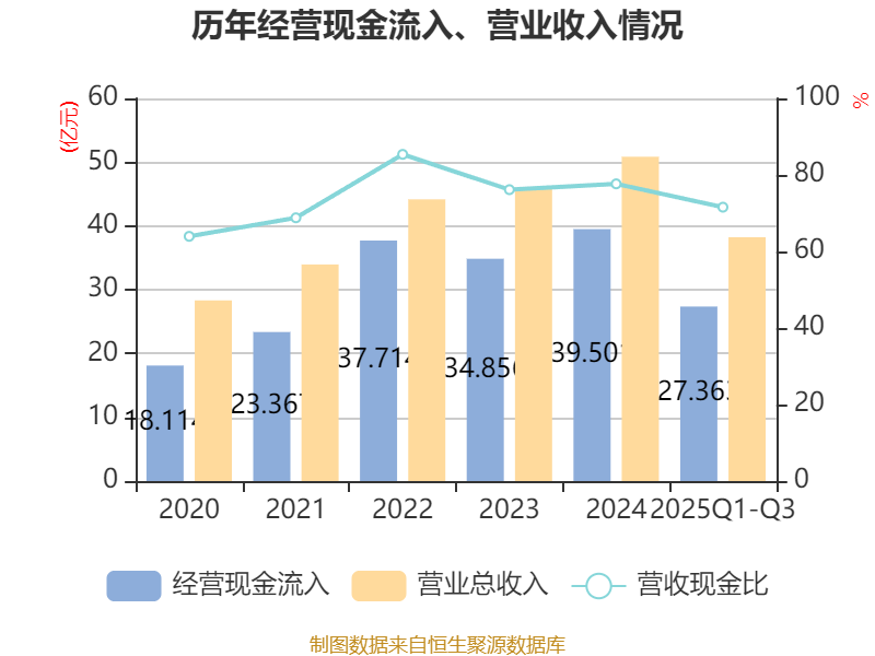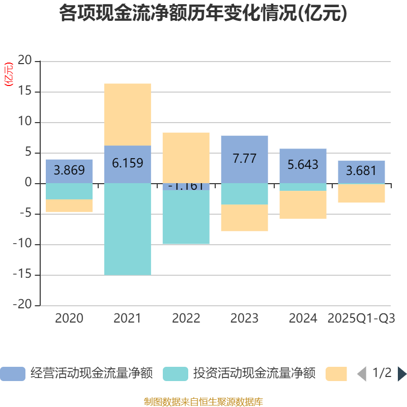 2025年前三季度,公司经营活动现金流净额为3.68亿元,同比下降21.72%;筹资活动现金流净额-2.99亿元,同比减少3684.25万元;投资活动现金流净额-1835.52万元,上年同期为-2.06亿元。