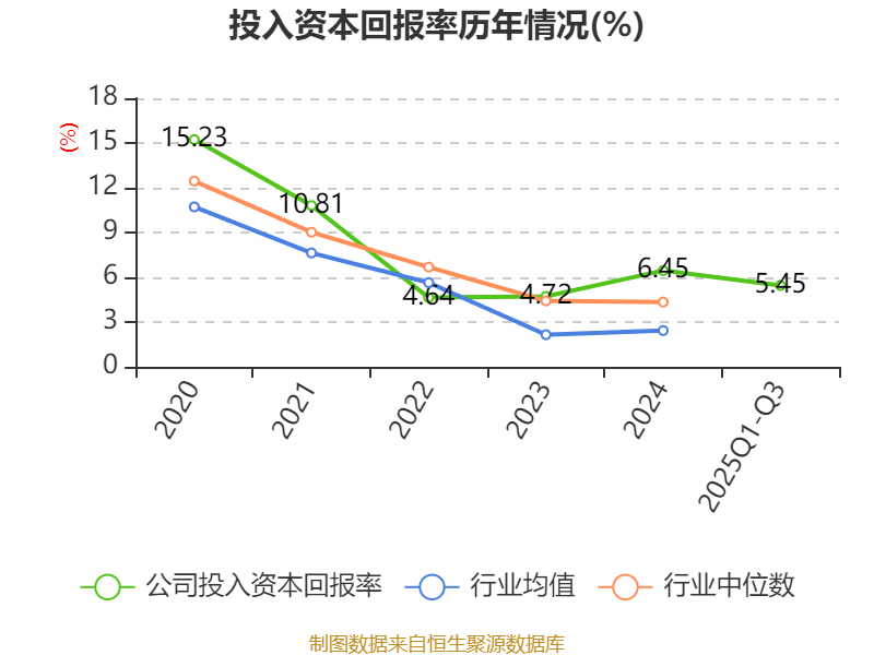 盈利能力方面, 2025年前三季度公司加权平均净资产收益率为6.55%,同比下降0.91个百分点。公司2025年前三季度投入资本回报率为5.45%,较上年同期下降0.08个百分点。