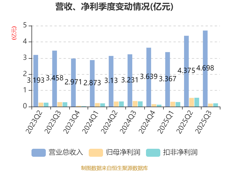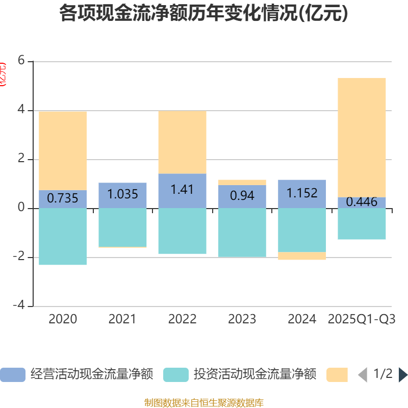 2025年前三季度,公司经营活动现金流净额为4455.95万元,同比下降60.4%;筹资活动现金流净额4.87亿元,同比增加5.45亿元;投资活动现金流净额-1.28亿元,上年同期为-1.69亿元。