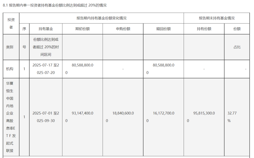 另外,截至6月30日,机构1持有华夏恒生中国内地企业高股息率ETF份额为8058.88万份,而到了9月30日,机构1持有华夏恒生中国内地企业高股息率ETF份额为0。