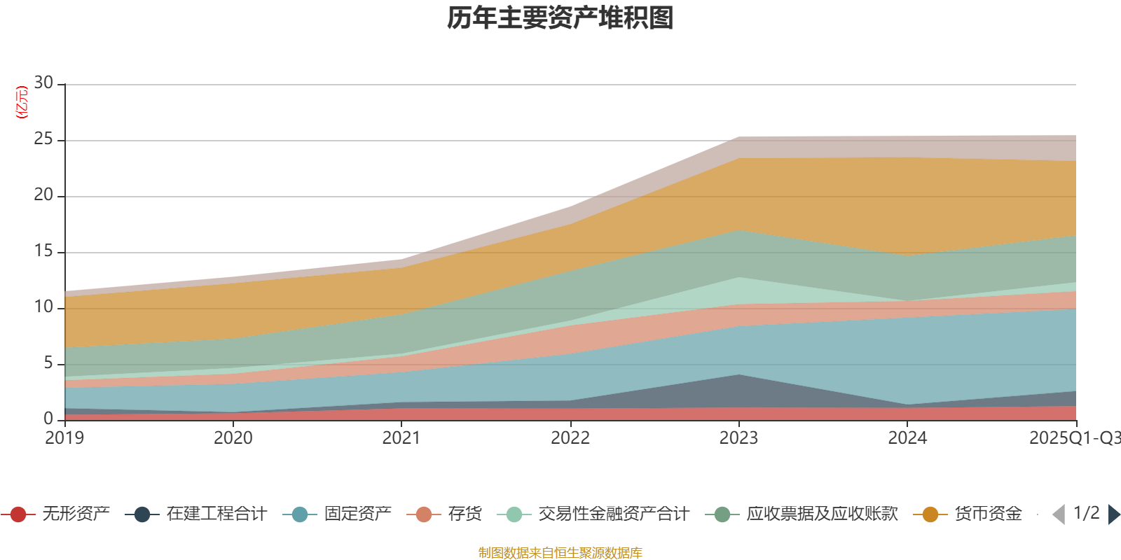 资产重大变化方面,截至2025年三季度末,公司货币资金较上年末减少24.4%,占公司总资产比重下降8.53个百分点;在建工程合计较上年末增加355.93%,占公司总资产比重上升4.12个百分点;交易性金融资产合计占公司总资产的3.15%,上年末为0;固定资产较上年末减少5.77%,占公司总资产比重下降1.84个百分点。
