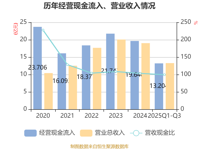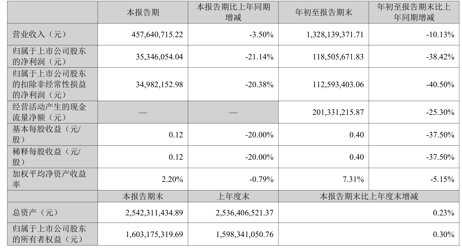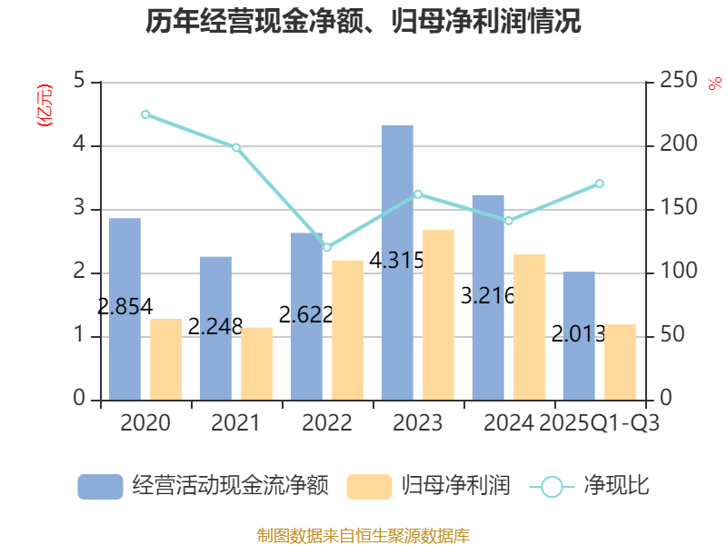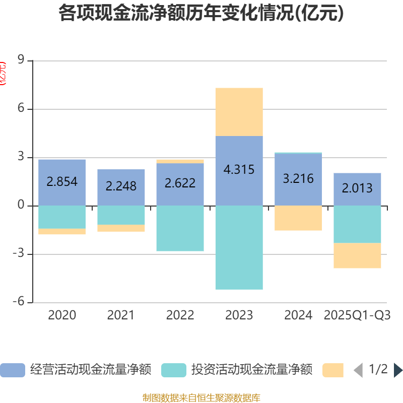 2025年前三季度,公司经营活动现金流净额为2.01亿元,同比下降25.3%;筹资活动现金流净额-1.56亿元,同比减少317.48万元;投资活动现金流净额-2.33亿元,上年同期为-7427.82万元。