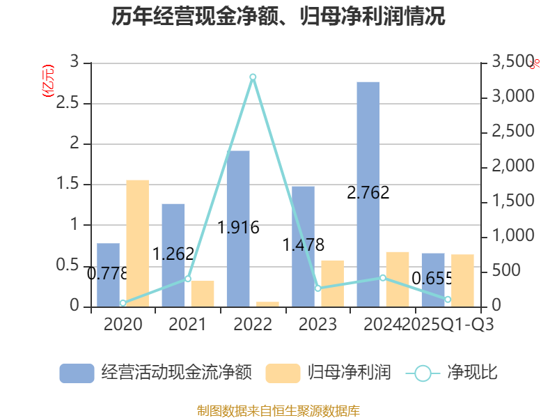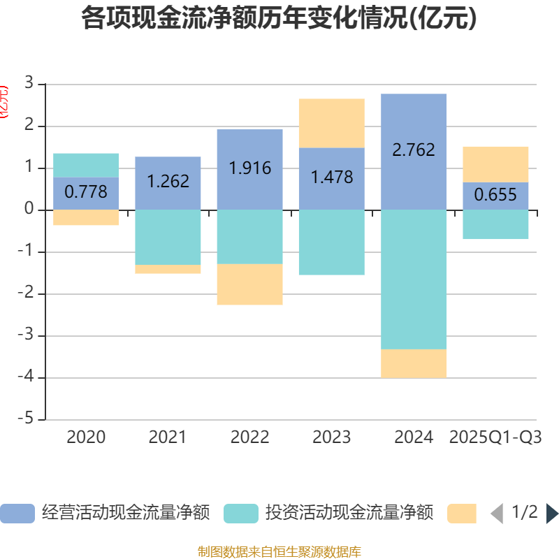 2025年前三季度,公司经营活动现金流净额为6553.63万元,同比下降49.91%;筹资活动现金流净额8457.23万元,同比增加8038.67万元;投资活动现金流净额-7013.99万元,上年同期为-2.67亿元。