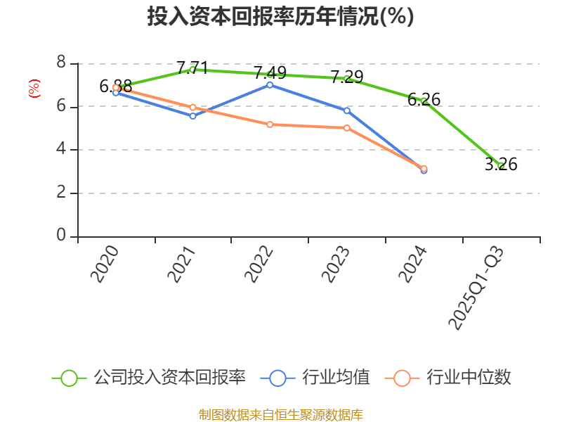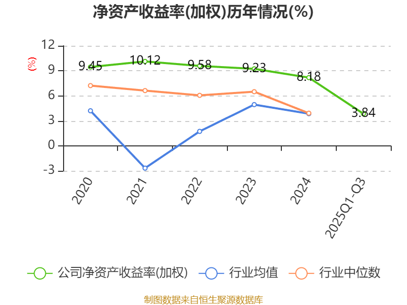 盈利能力方面, 2025年前三季度公司加权平均净资产收益率为3.84%,同比下降1.85个百分点。公司2025年前三季度投入资本回报率为3.26%,较上年同期下降1.17个百分点。