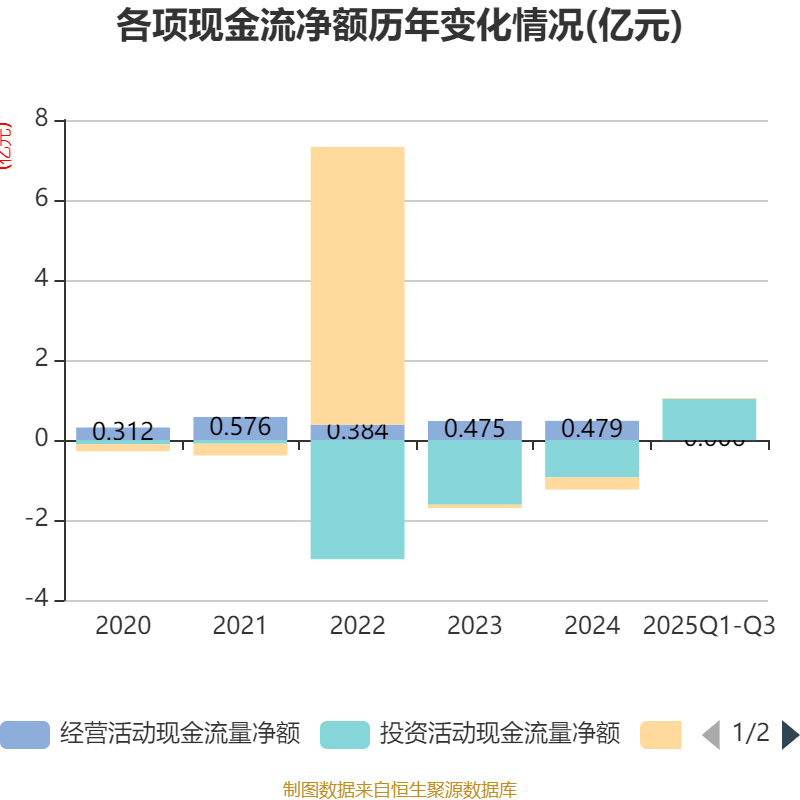 2025年前三季度,公司经营活动现金流净额为-64.81万元,同比减少535.49万元;筹资活动现金流净额238.14万元,同比增加3928.27万元;投资活动现金流净额1.02亿元,上年同期为-7003.64万元。