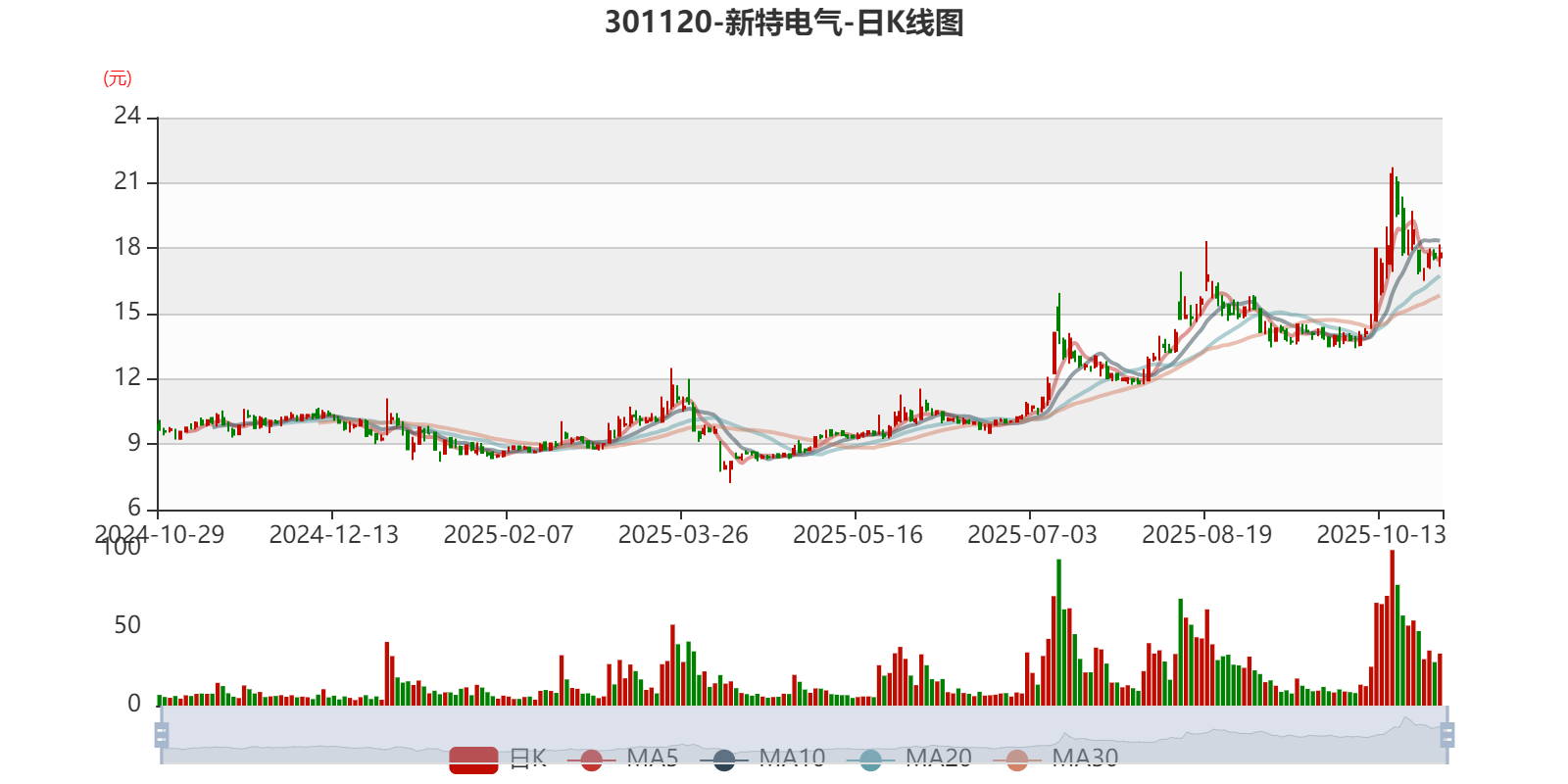 中证智能财讯新特电气(301120)10月29日披露2025年第三季度报告。前三季度公司实现营业总收入3.24亿元,同比增长12.80%;归母净利润3772.83万元,同比增长231.99%;扣非净利润亏损129.74万元,上年同期盈利74.13万元;经营活动产生的现金流量净额为-64.81万元,上年同期为470.67万元;报告期内,新特电气基本每股收益为0.1元,加权平均净资产收益率为2.48%。