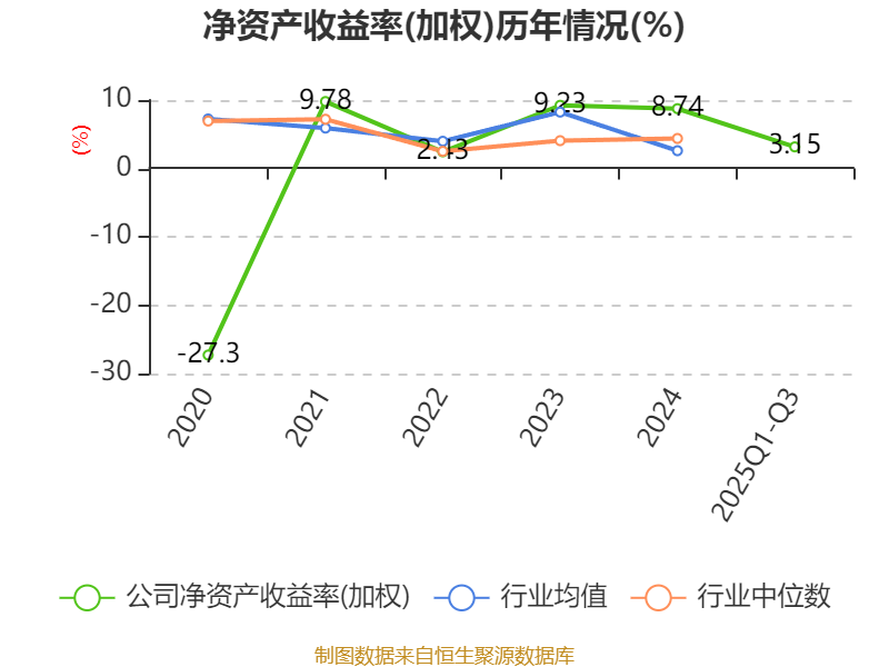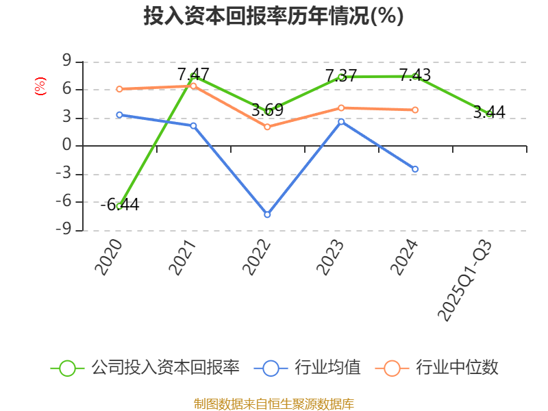 盈利能力方面, 2025年前三季度公司加权平均净资产收益率为3.15%,同比下降1.54个百分点。公司2025年前三季度投入资本回报率为3.44%,较上年同期下降0.75个百分点。