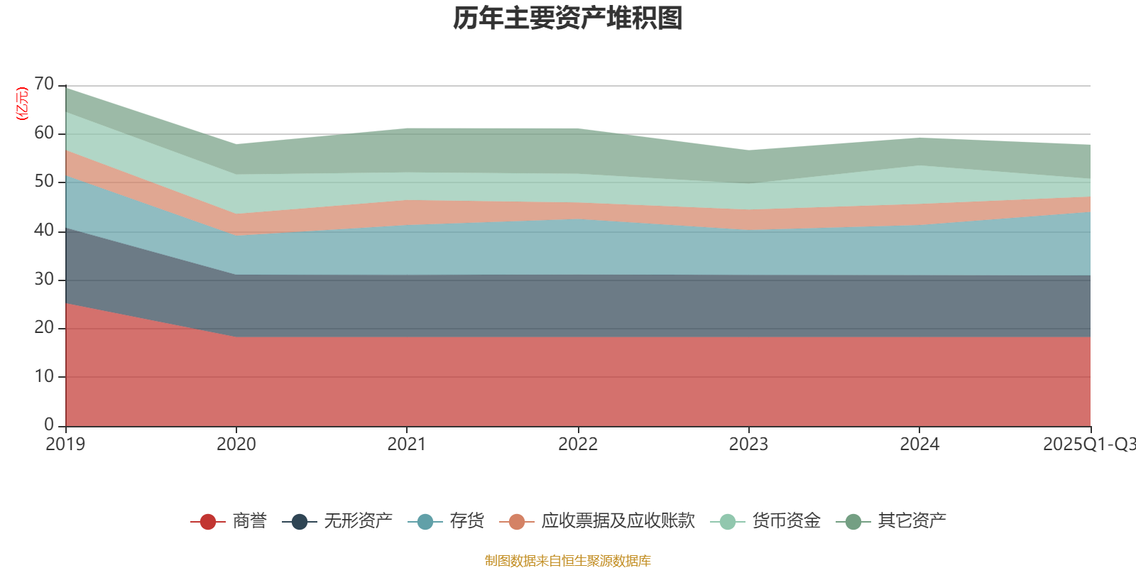 资产重大变化方面,截至2025年三季度末,公司货币资金较上年末减少53.62%,占公司总资产比重下降7.02个百分点;存货较上年末增加26.86%,占公司总资产比重上升5.22个百分点;应收票据及应收账款较上年末减少27.56%,占公司总资产比重下降1.89个百分点;商誉较上年末没有变化,占公司总资产比重上升0.77个百分点。