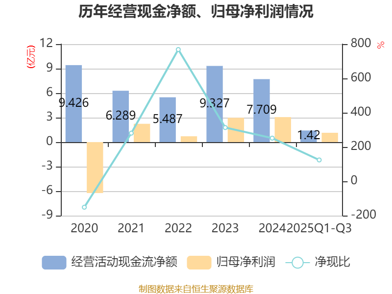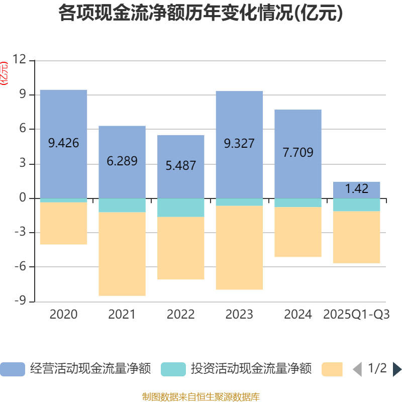 2025年前三季度,公司经营活动现金流净额为1.42亿元,同比下降62.08%;筹资活动现金流净额-4.52亿元,同比增加1439.33万元;投资活动现金流净额-1.15亿元,上年同期为-5319.17万元。