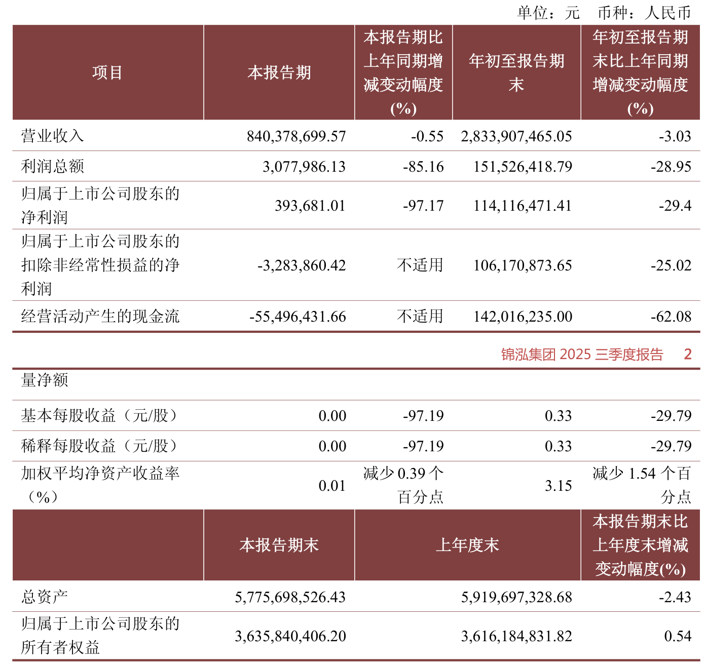 中证智能财讯锦泓集团(603518)10月29日披露2025年第三季度报告。前三季度公司实现营业总收入28.34亿元,同比下降3.03%;归母净利润1.14亿元,同比下降29.40%;扣非净利润1.06亿元,同比下降25.02%;经营活动产生的现金流量净额为1.42亿元,同比下降62.08%;报告期内,锦泓集团基本每股收益为0.33元,加权平均净资产收益率为3.15%。