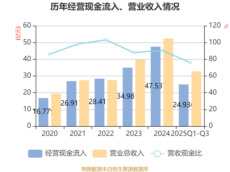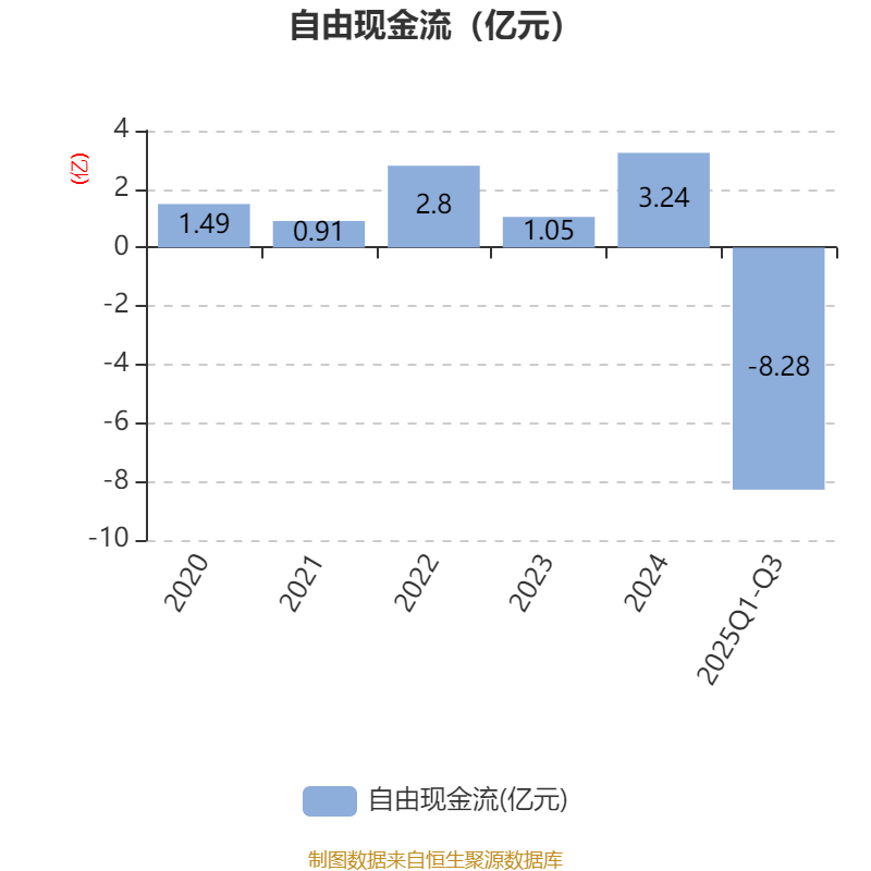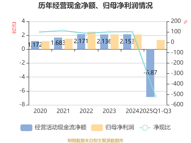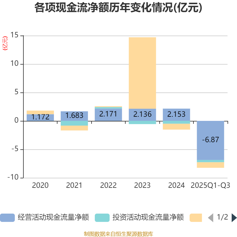 2025年前三季度,公司经营活动现金流净额为-6.87亿元,同比减少1.54亿元;筹资活动现金流净额-9745.09万元,同比减少6966.95万元;投资活动现金流净额-4050.61万元,上年同期为-3.73亿元。