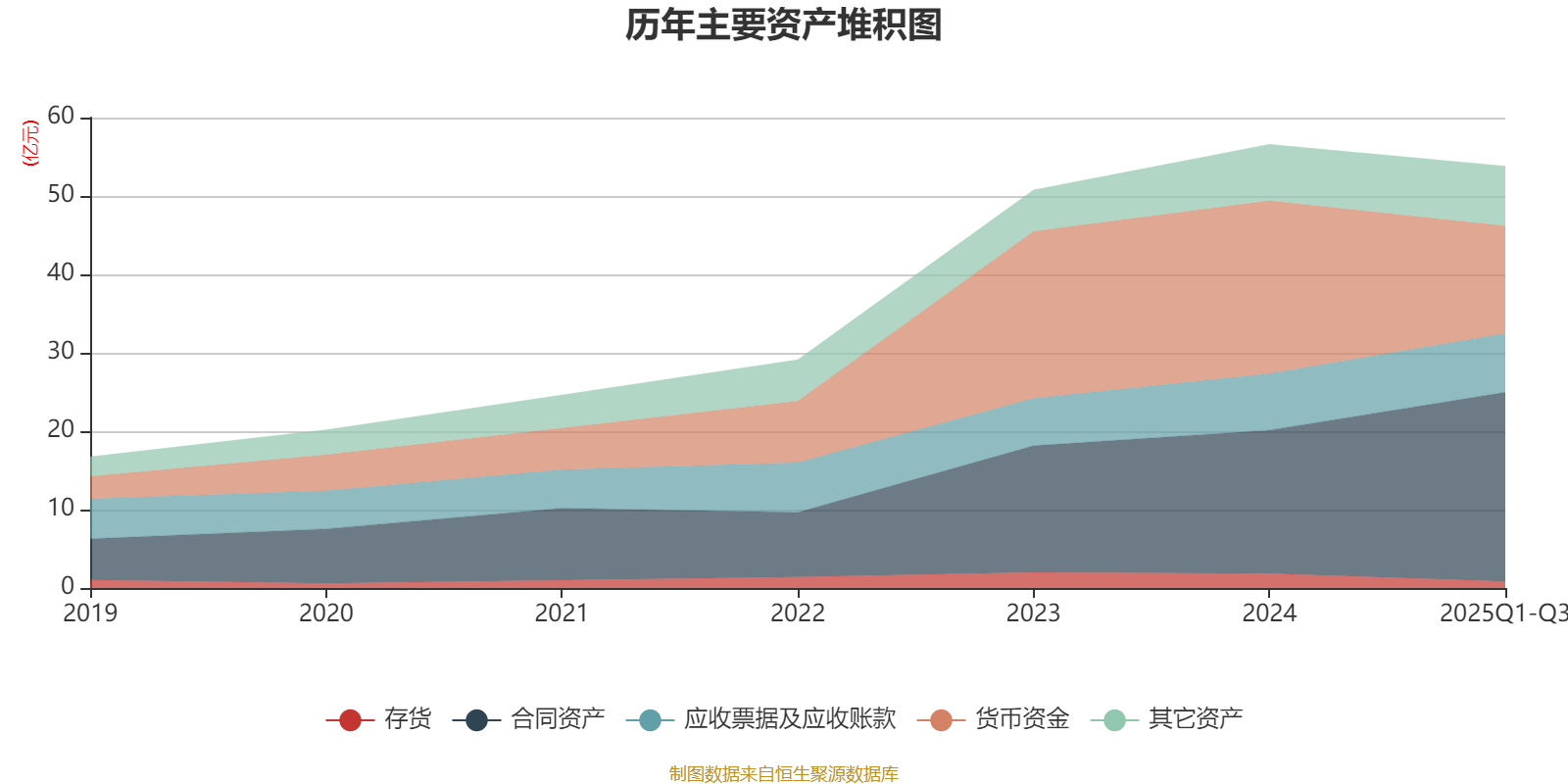 资产重大变化方面,截至2025年三季度末,公司货币资金较上年末减少37.77%,占公司总资产比重下降13.46个百分点;合同资产较上年末增加31.83%,占公司总资产比重上升12.5个百分点;存货较上年末减少53.77%,占公司总资产比重下降1.67个百分点;其他流动资产较上年末增加93.22%,占公司总资产比重上升1.53个百分点。
