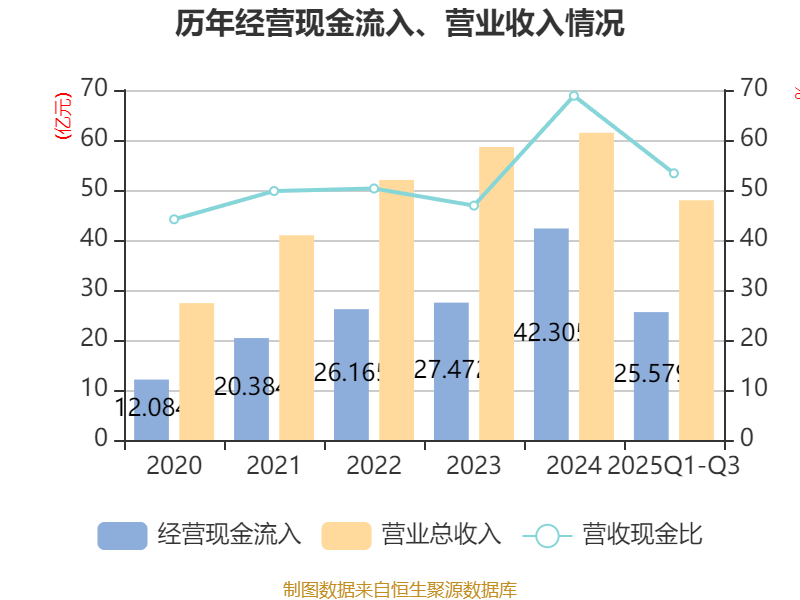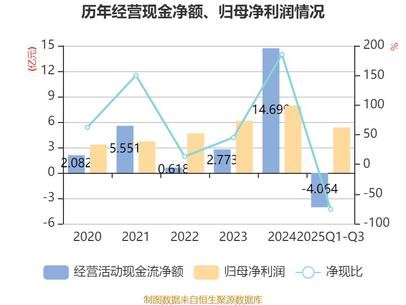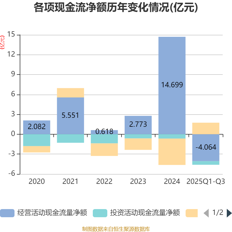 2025年前三季度,公司经营活动现金流净额为-4.06亿元,同比减少12.3亿元;筹资活动现金流净额1.74亿元,同比增加4.02亿元;投资活动现金流净额-5434.11万元,上年同期为-6021.4万元。