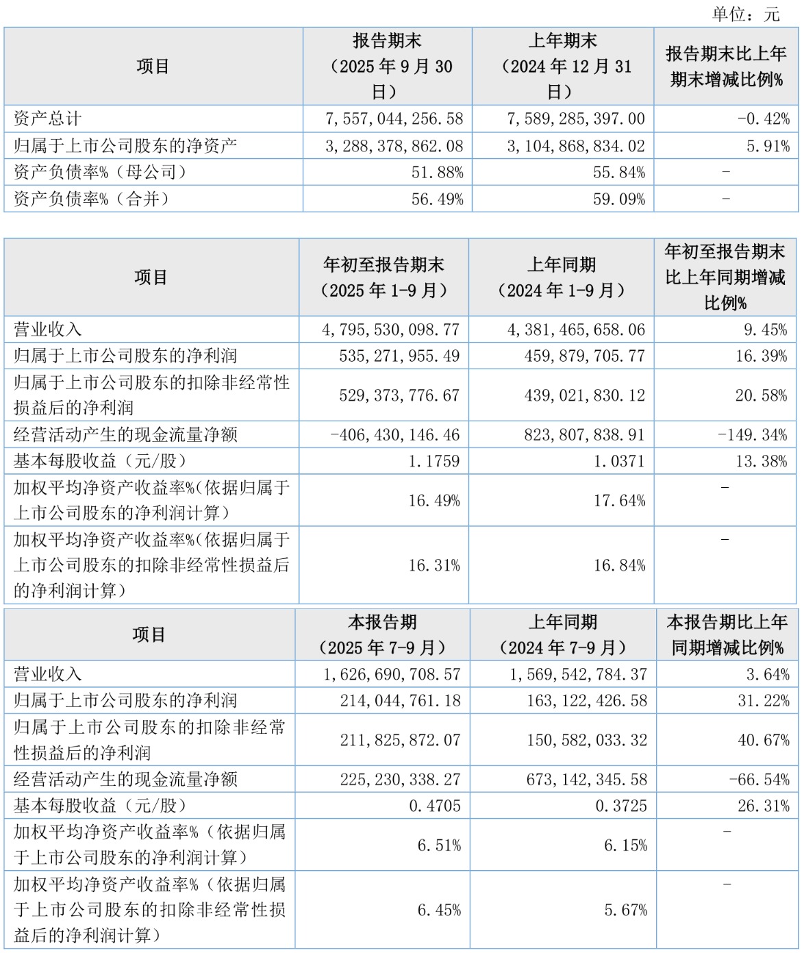 2025年前三季度,公司流动比率为1.59,速动比率为1.31。