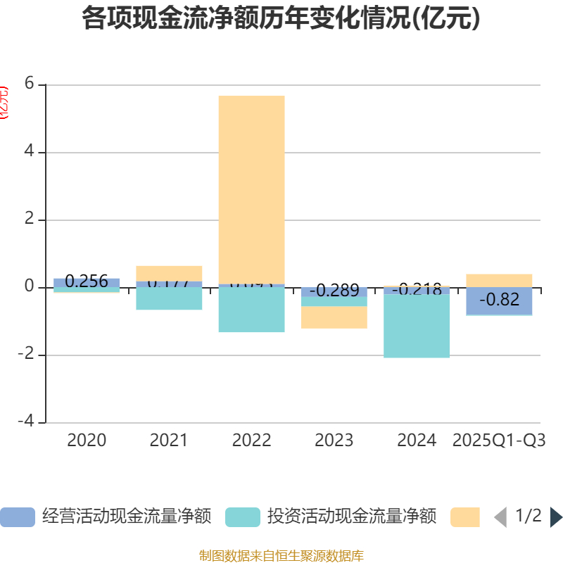 2025年前三季度,公司经营活动现金流净额为-8202.01万元,同比减少4476.07万元;筹资活动现金流净额3849.73万元,同比增加2688.06万元;投资活动现金流净额-257.12万元,上年同期为-9851.31万元。