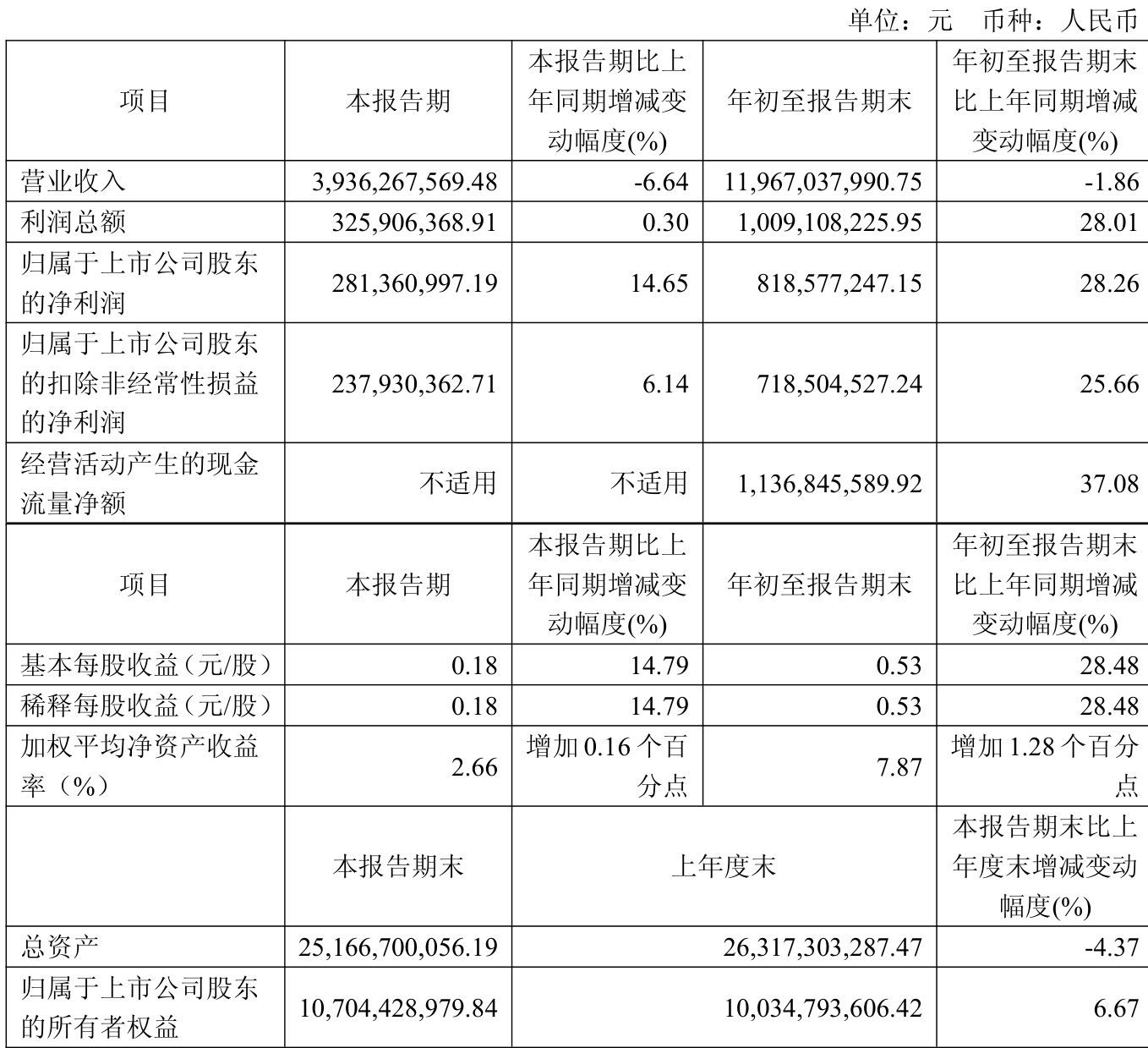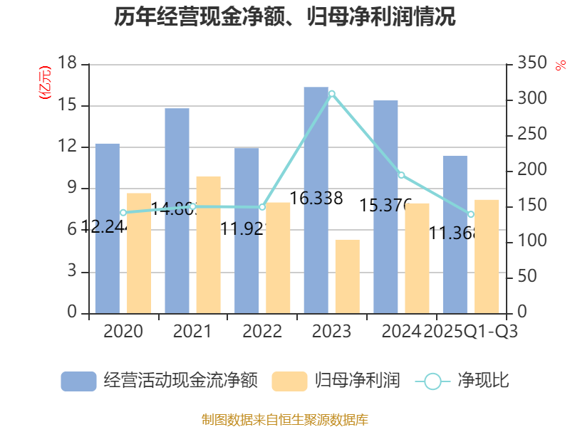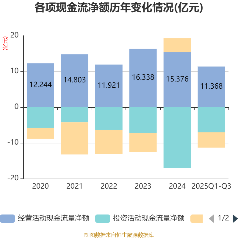 2025年前三季度,公司经营活动现金流净额为11.37亿元,同比增长37.08%;筹资活动现金流净额-4.27亿元,同比减少8.63亿元;投资活动现金流净额-7.08亿元,上年同期为-10.1亿元。