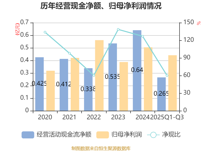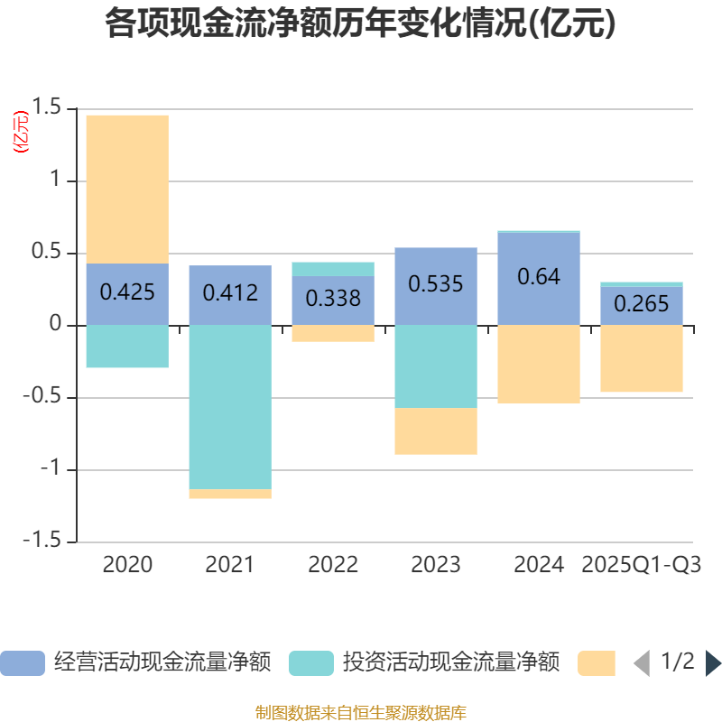 2025年前三季度,公司经营活动现金流净额为2649.43万元,同比下降13.37%;筹资活动现金流净额-4635.79万元,同比增加919.01万元;投资活动现金流净额309.67万元,上年同期为1916.19万元。