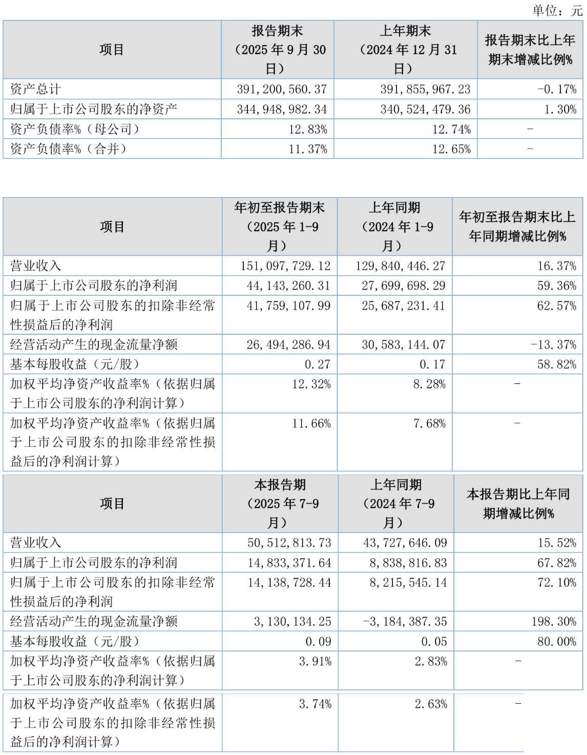 负债重大变化方面,截至2025年三季度末,公司其他应付款(含利息和股利)较上年末减少95.39%,占公司总资产比重下降1.76个百分点;应付票据及应付账款较上年末增加51.93%,占公司总资产比重上升1.74个百分点;应付职工薪酬较上年末减少81.4%,占公司总资产比重下降1.44个百分点;应交税费较上年末减少62.2%,占公司总资产比重下降0.96个百分点。