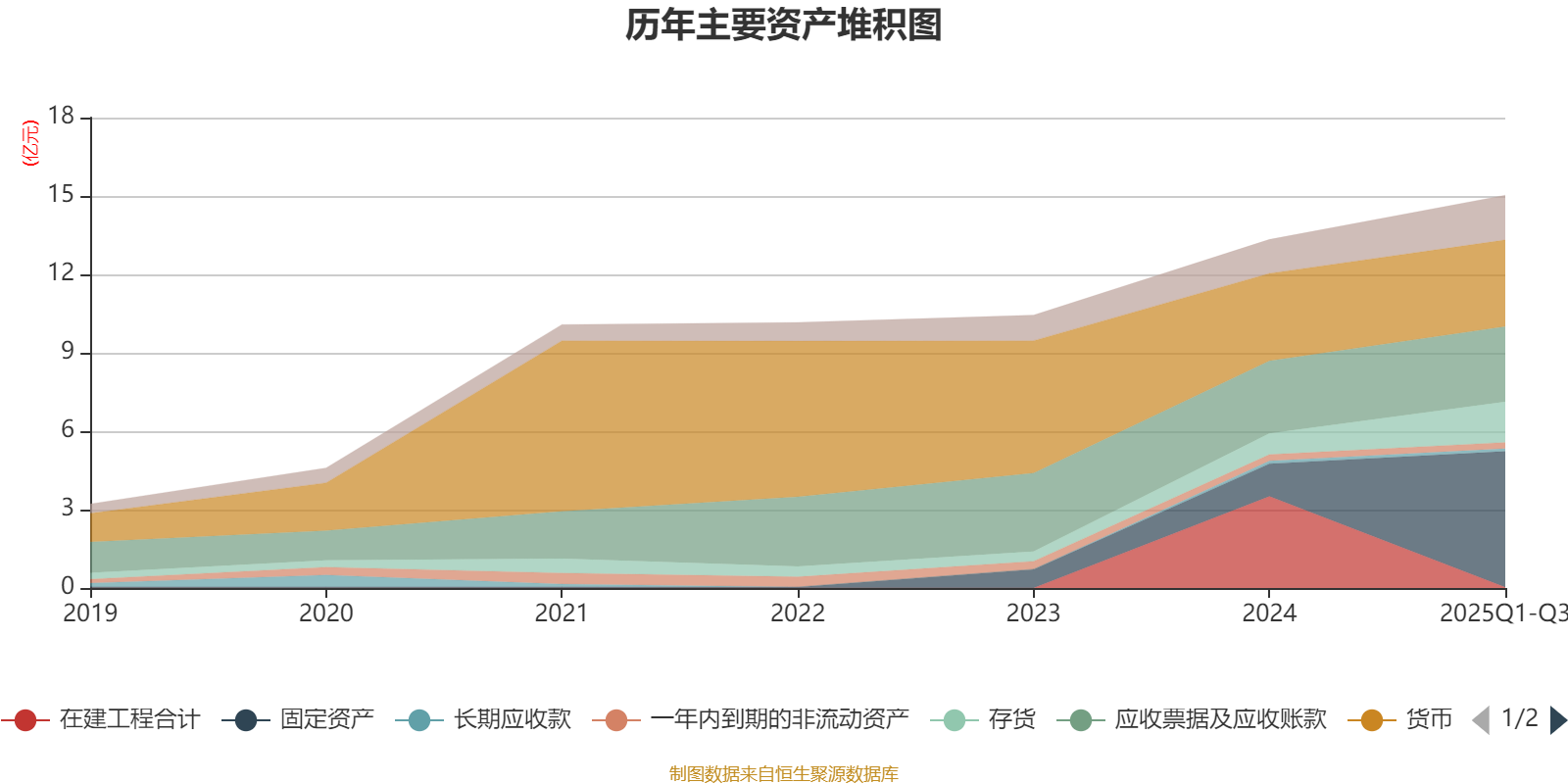 资产重大变化方面,截至2025年三季度末,公司在建工程合计较上年末减少99.09%,占公司总资产比重下降26.08个百分点;固定资产较上年末增加315.68%,占公司总资产比重上升25.2个百分点;存货较上年末增加91.11%,占公司总资产比重上升4.24个百分点;货币资金较上年末减少0.97%,占公司总资产比重下降3.04个百分点。