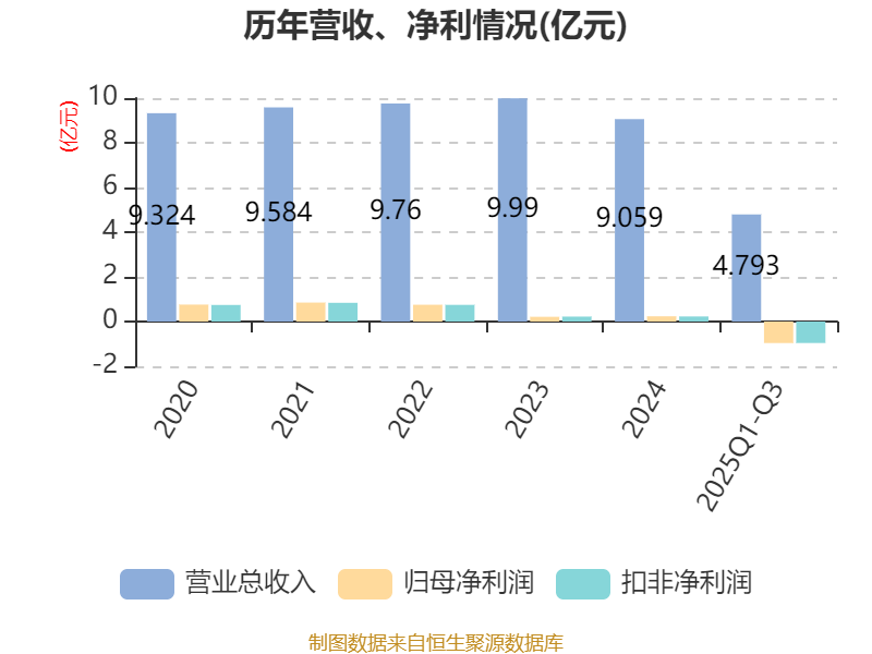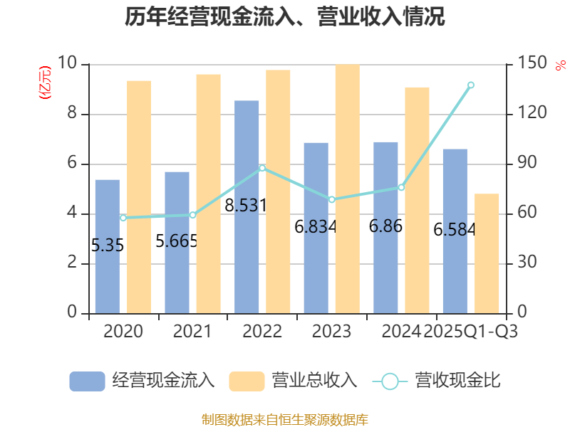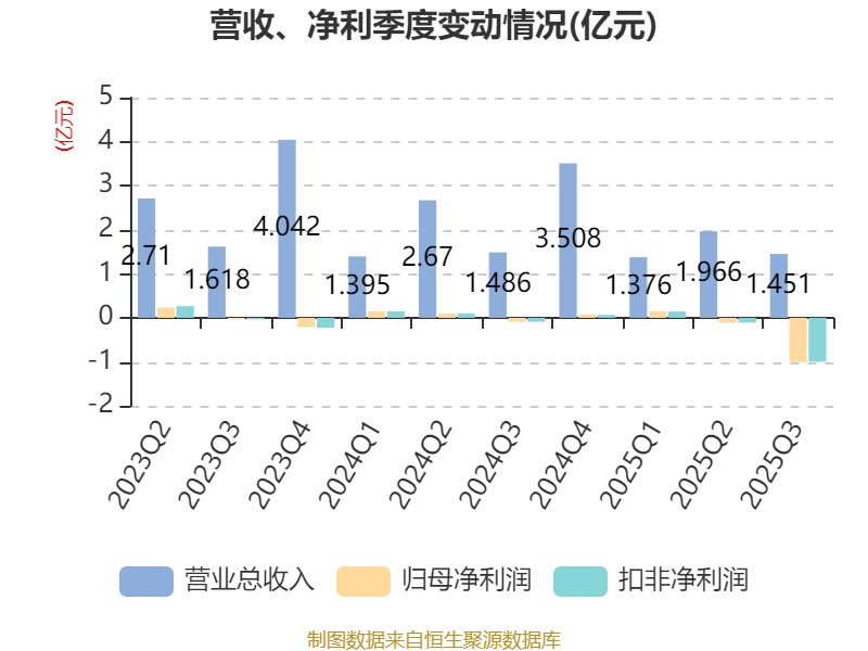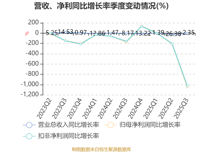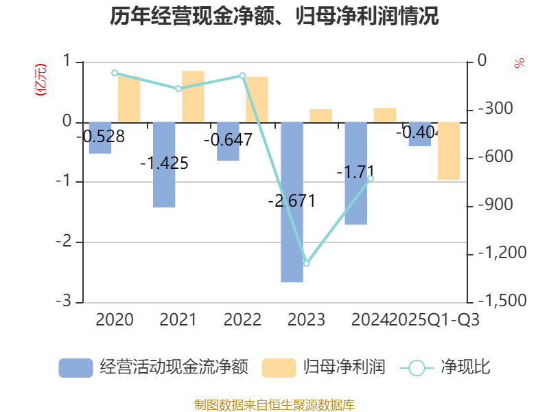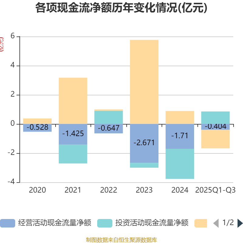 2025年前三季度,公司经营活动现金流净额为-4042.06万元,同比增加1.94亿元;筹资活动现金流净额-1.27亿元,同比减少1.77亿元;投资活动现金流净额8551.1万元,上年同期为-2.17亿元。
