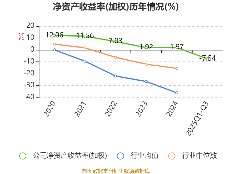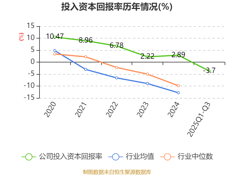 盈利能力方面, 2025年前三季度公司加权平均净资产收益率为-7.54%,同比下降8.91个百分点。公司2025年前三季度投入资本回报率为-3.7%,较上年同期下降5.85个百分点。