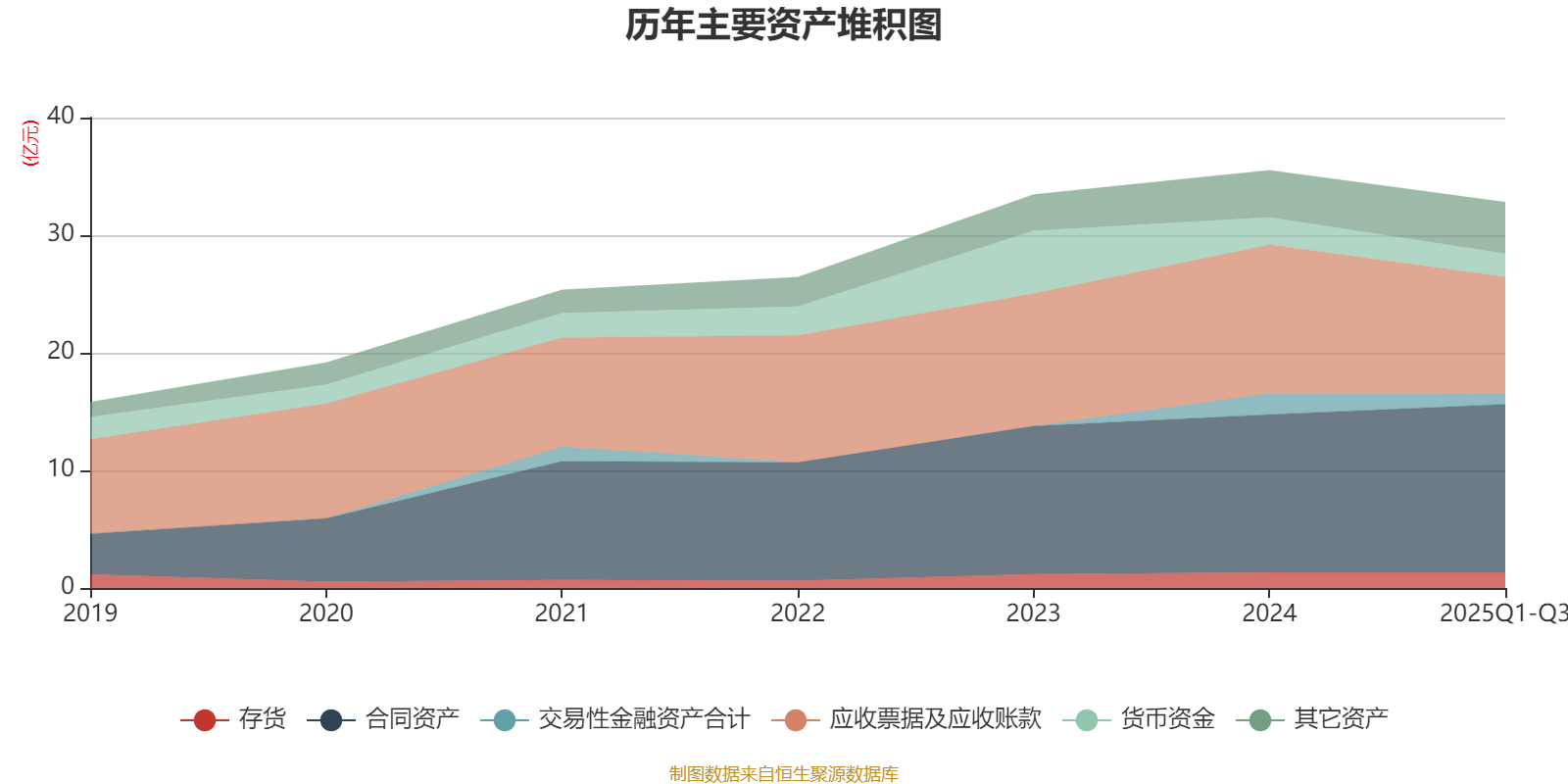 资产重大变化方面,截至2025年三季度末,公司合同资产较上年末增加6.47%,占公司总资产比重上升5.77个百分点;应收票据及应收账款较上年末减少21.31%,占公司总资产比重下降5.26个百分点;交易性金融资产合计较上年末减少50.16%,占公司总资产比重下降2.34个百分点;递延所得税资产较上年末增加22.31%,占公司总资产比重上升0.73个百分点。