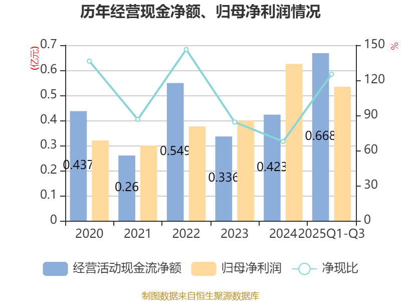 2025年前三季度,公司经营活动现金流净额为6678.04万元,同比增长70.88%;筹资活动现金流净额-2736.7万元,同比减少1826.67万元;投资活动现金流净额-1.26亿元,上年同期为-2428.32万元。
