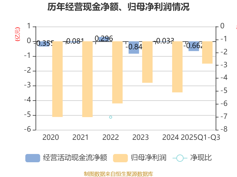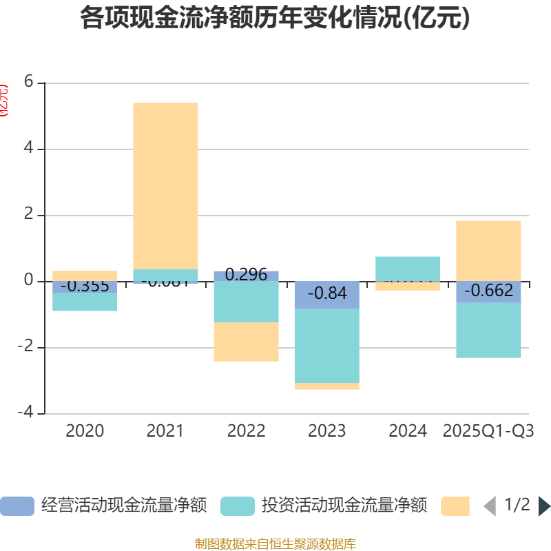 2025年前三季度,公司经营活动现金流净额为-6616.5万元,同比减少4091.92万元;筹资活动现金流净额1.82亿元,同比增加1.93亿元;投资活动现金流净额-1.66亿元,上年同期为6350.79万元。