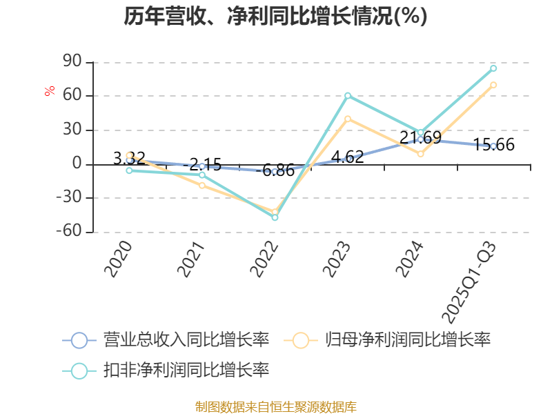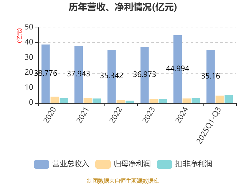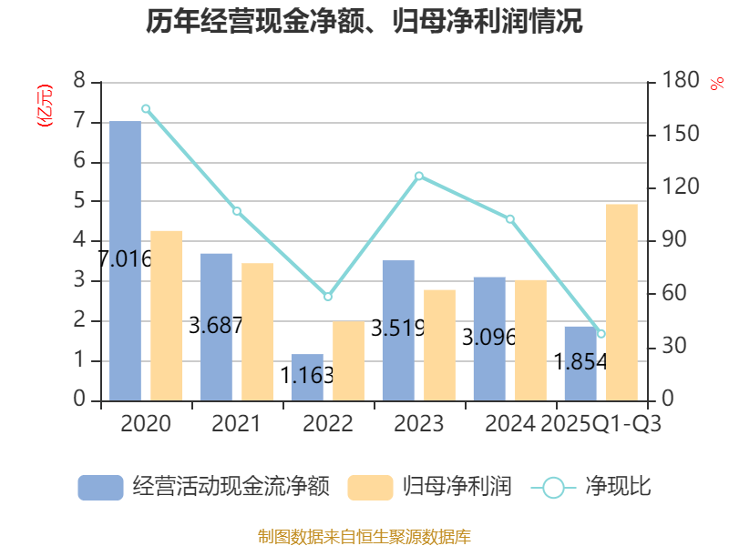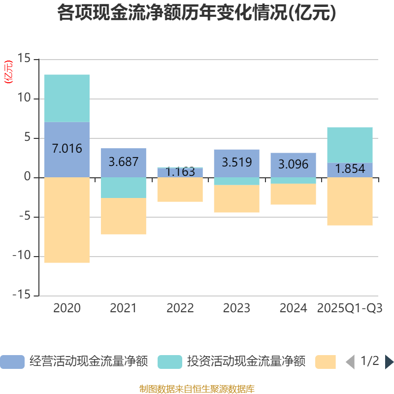 2025年前三季度,公司经营活动现金流净额为1.85亿元,同比增加4.28亿元;筹资活动现金流净额-6.11亿元,同比减少6.15亿元;投资活动现金流净额4.49亿元,上年同期为2247.83万元。