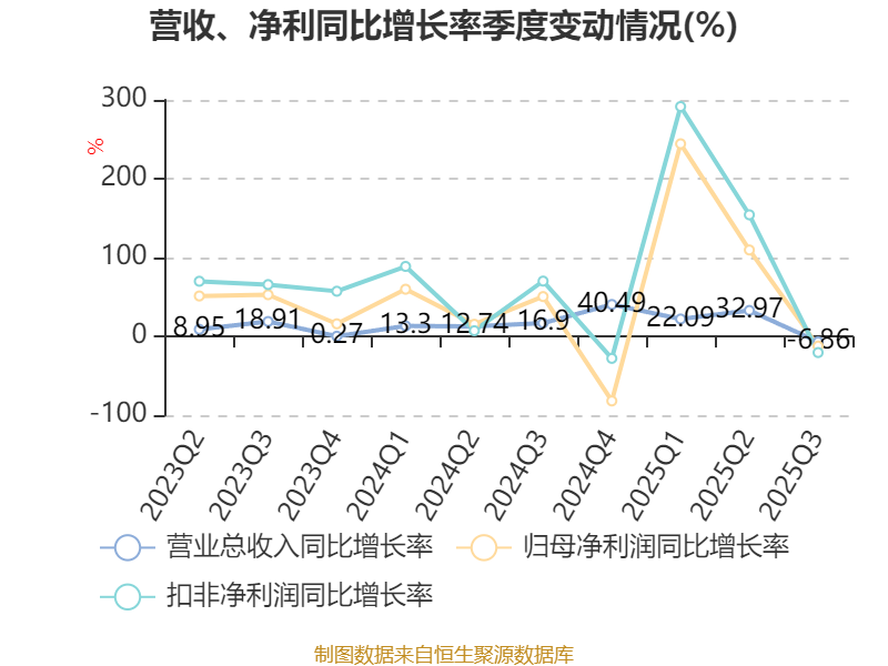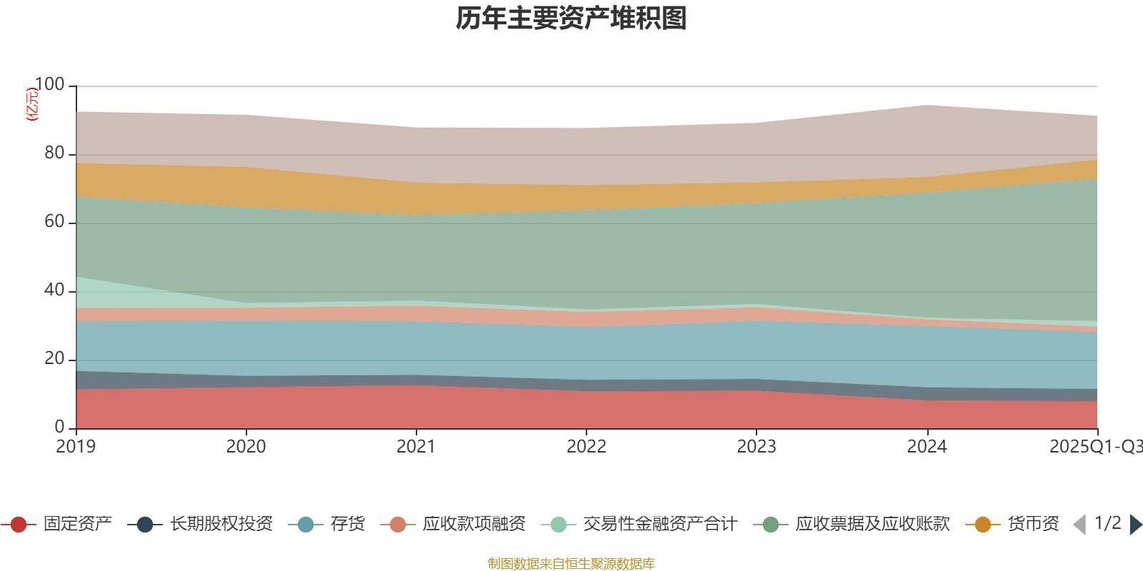 资产重大变化方面,截至2025年三季度末,公司应收票据及应收账款较上年末增加13.77%,占公司总资产比重上升6.85个百分点;一年内到期的非流动资产较上年末减少98.41%,占公司总资产比重下降4.59个百分点;其他应收款(含利息和股利)较上年末减少85.6%,占公司总资产比重下降3.71个百分点;货币资金较上年末增加23.07%,占公司总资产比重上升1.32个百分点。