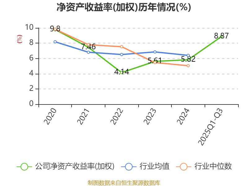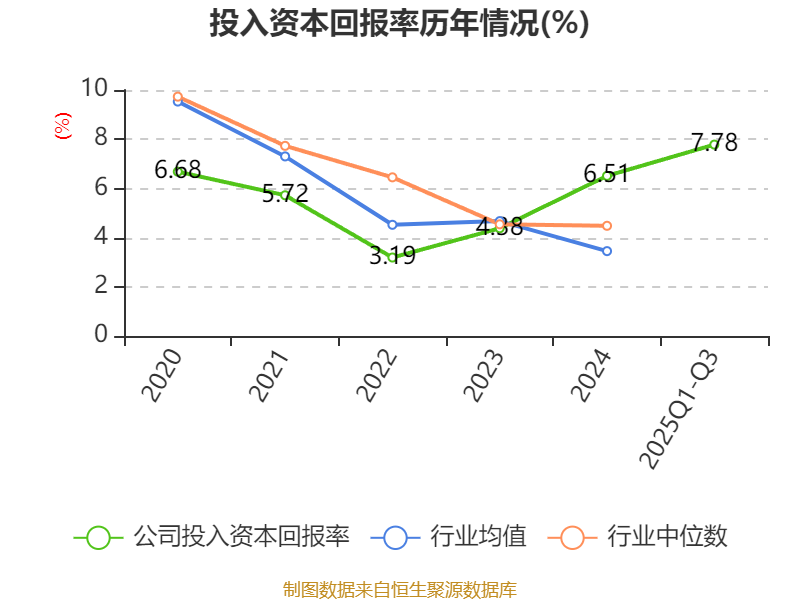 盈利能力方面, 2025年前三季度公司加权平均净资产收益率为8.87%,同比上升3.32个百分点。公司2025年前三季度投入资本回报率为7.78%,较上年同期上升3.36个百分点。